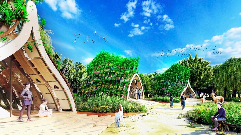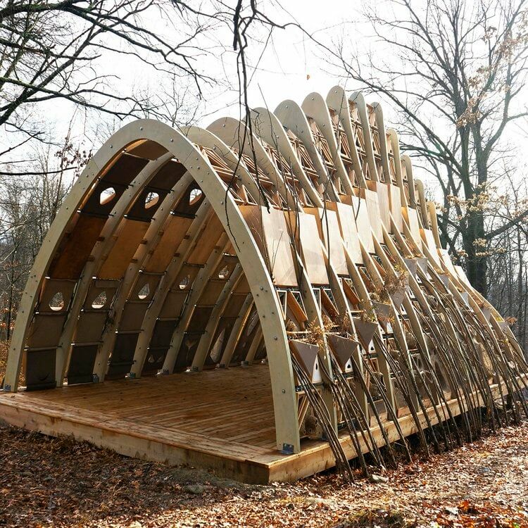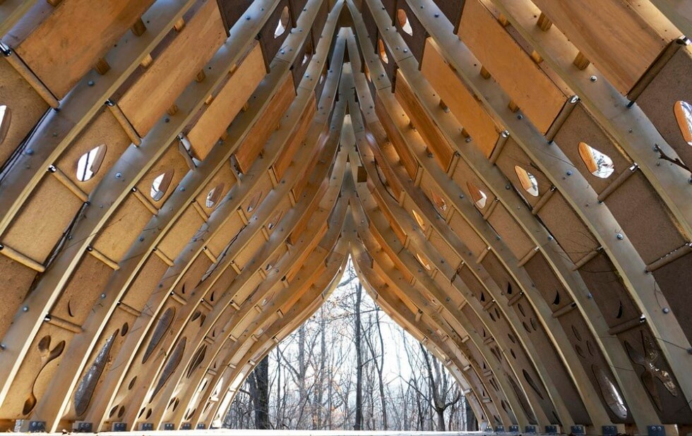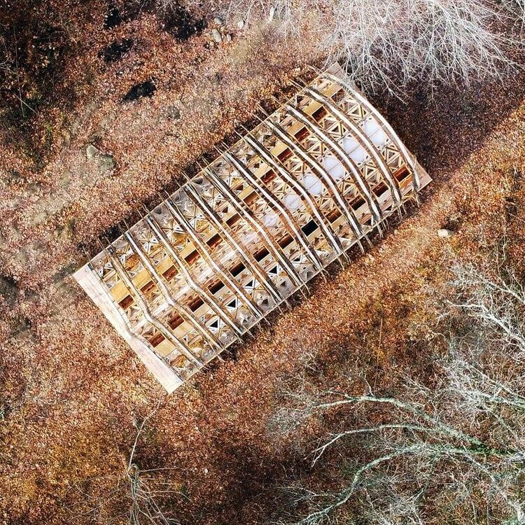 The structure pushes the boundaries of regenerative design and minimizes carbon footprint .It combines indigenous tree-grafting techniques with computationally designed cross-laminated timber (CLT) arch scaffolds so it comes out as an extension of its surrounding ecosystem.