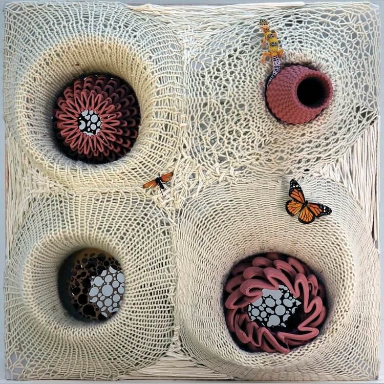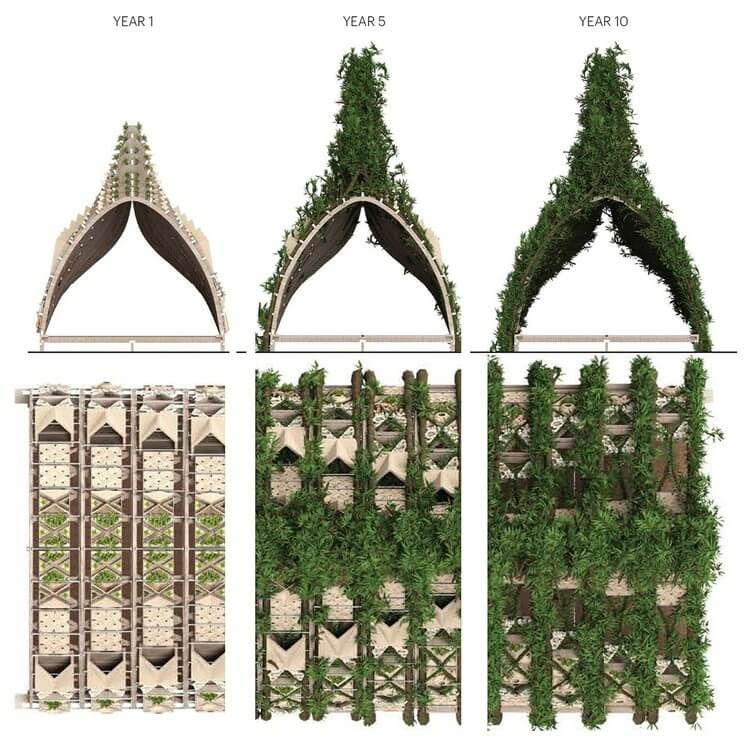 These tree clusters are shaped on site within large recyclable timber scaffolds and in years’ time, they will grow to support the modular multispecies wall system. Meanwhile, wall elements are made from a mix of handmade crocheted jute fibers and 3D-printed bioplastic volumes. The volumes serve as micro-habitats and food webs for plants and animals to thrive, thus increasing biodiversity in the process.