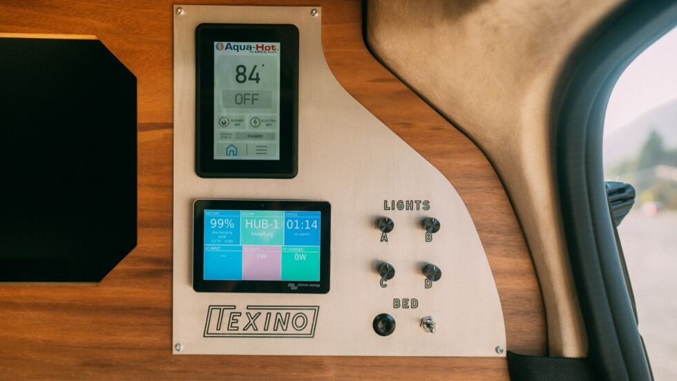 An outdoor shower with a privacy curtain lets you stay fresh on the road. This van even has 25 gallons of fresh water and 22 gallons of grey water tank. Then there’s the continuous hot water system. To make it withstand the outdoors, the millwork on the Texino Switchback II comes with Fenix laminate to make the wood fingerprint and scratch-resistant.