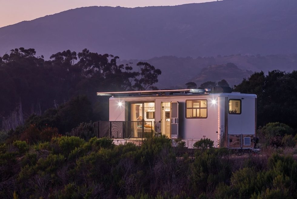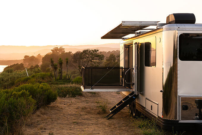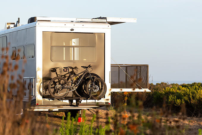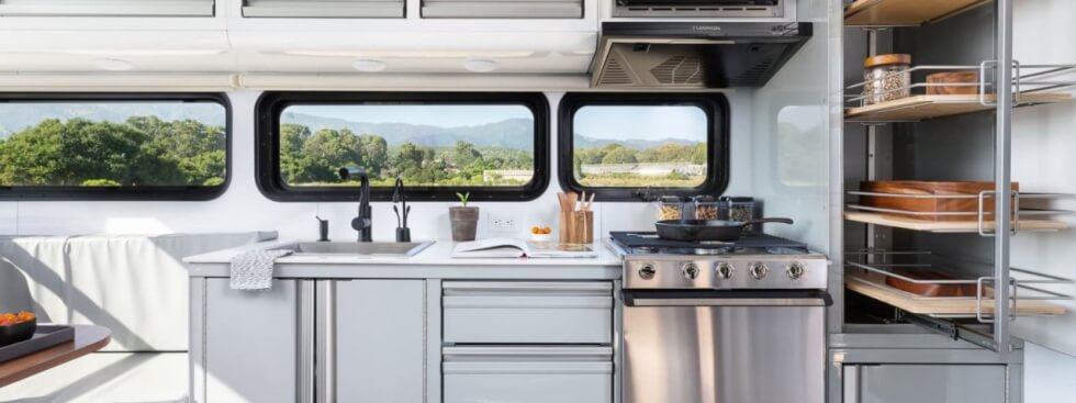It has an all-aluminum shell and subfloor and marine-grade materials for superior quality. It has premium interior offerings including a spa-style bathroom, a fully-functional kitchen with a removable cooking island, and a 13 cu.ft. all-electric solar refrigerator. Optional add-ons include a stainless steel dishwasher and a three-burner oven.
