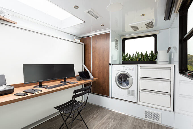 Best of all, the 2021 Living Vehicle CORE has a limitless supply of solar power. This makes accessing your entertainment or office needs possible even when living off-grid. It uses the PRO-EV Power add-on which comprises of a Level 2 charger with dual 8kW inverters and a 16,000-watt output. This charge can easily power up electric vehicles, cars, and motorcycles alike.