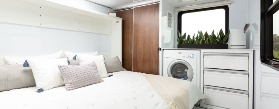 The 2021 Living Vehicle CORE imitates home living. Its sleeping area has a queen-sized bed paired with a cool-touch 8-inch memory foam mattress. An LV exclusive Starview skylight and the sleeping space easily transforms into a media room with optional 70” 4K HD Private Home Theater and SONOS surround sound option.