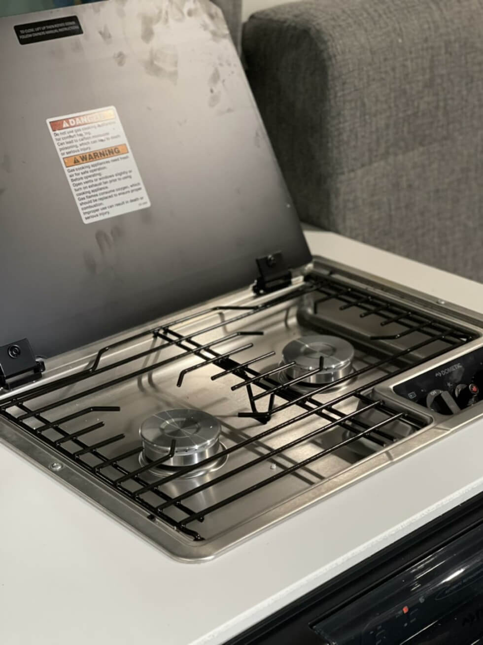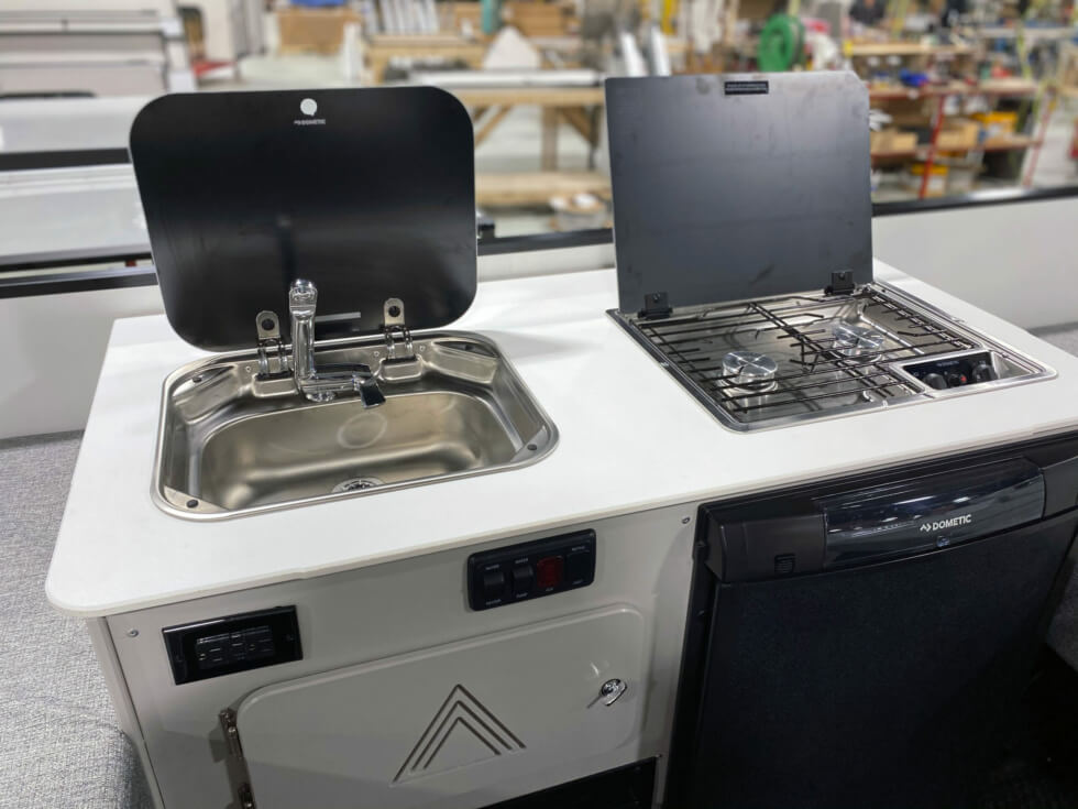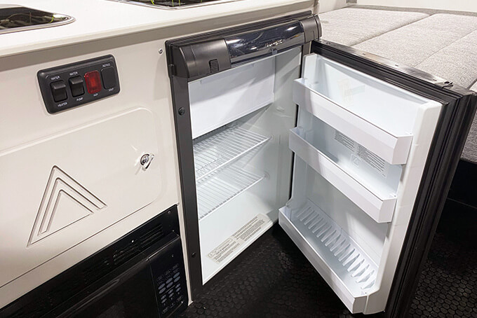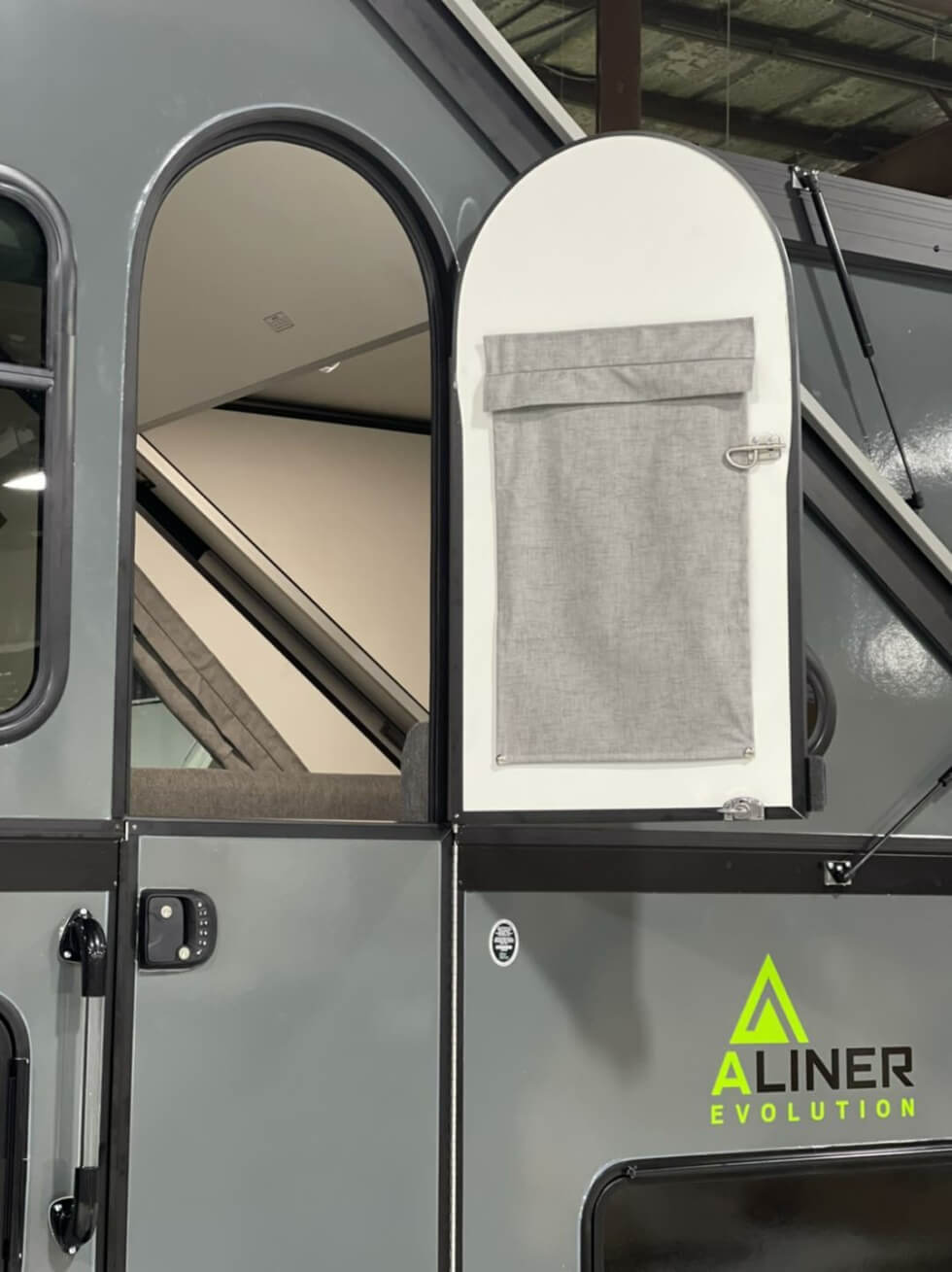 Moreover, the Aliner Evolution comes equipped with modern machines to make your home away from home comfortable. It has a stove, refrigerator, a sink, and a cabinet concealed swivel cassette toilet. Storage options include one 13” x 16” and two large 13” x 36” bag doors. Best of all, it boasts a deployable 32” x 32” shower that stows away unto the floor.
