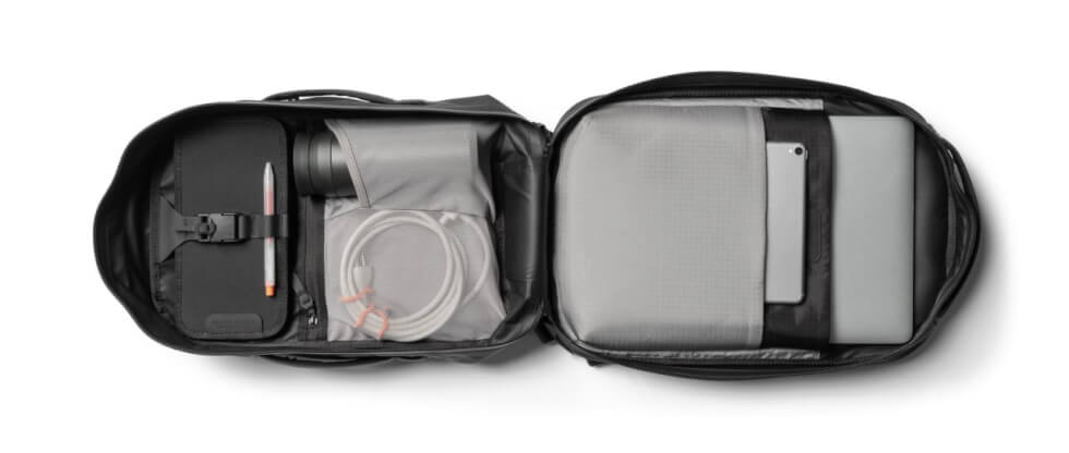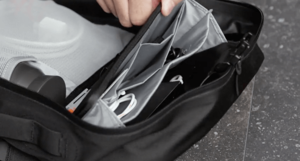 The main compartment zips open clamshell-style to reveal a foam-padded base and two suspended sleeves on one side to store a laptop and a tablet. The opposite side has a couple of meshed pockets, one for a water bottle and the other for other essentials.