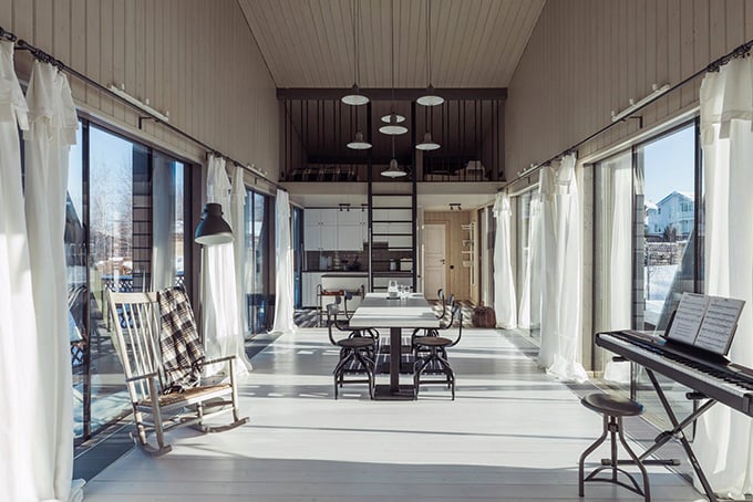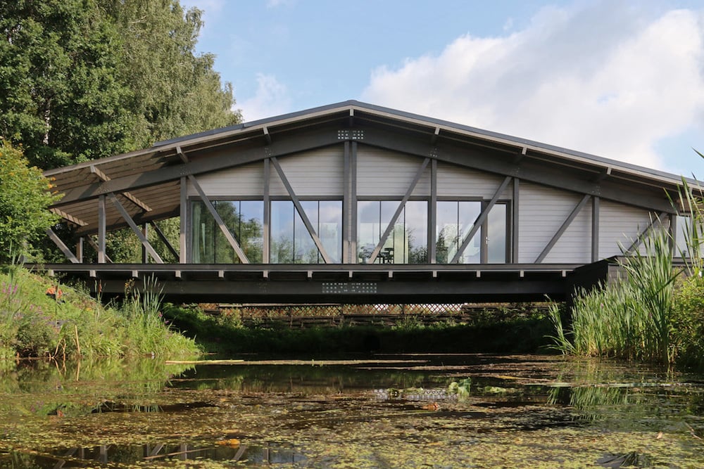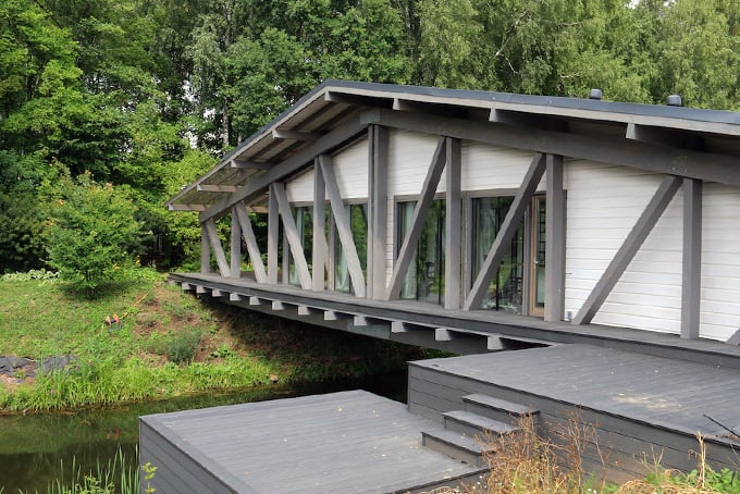 It features mostly wooden, with its main structure heavily reliant on the material. But it’s also got plenty of glazing. As the name suggests, it doubles as a bridge, which means it provides access to either sides of the riverbank. Yes, the owners can actually enter one side and emerge on the other, thereby crossing the river. Pretty neat idea.