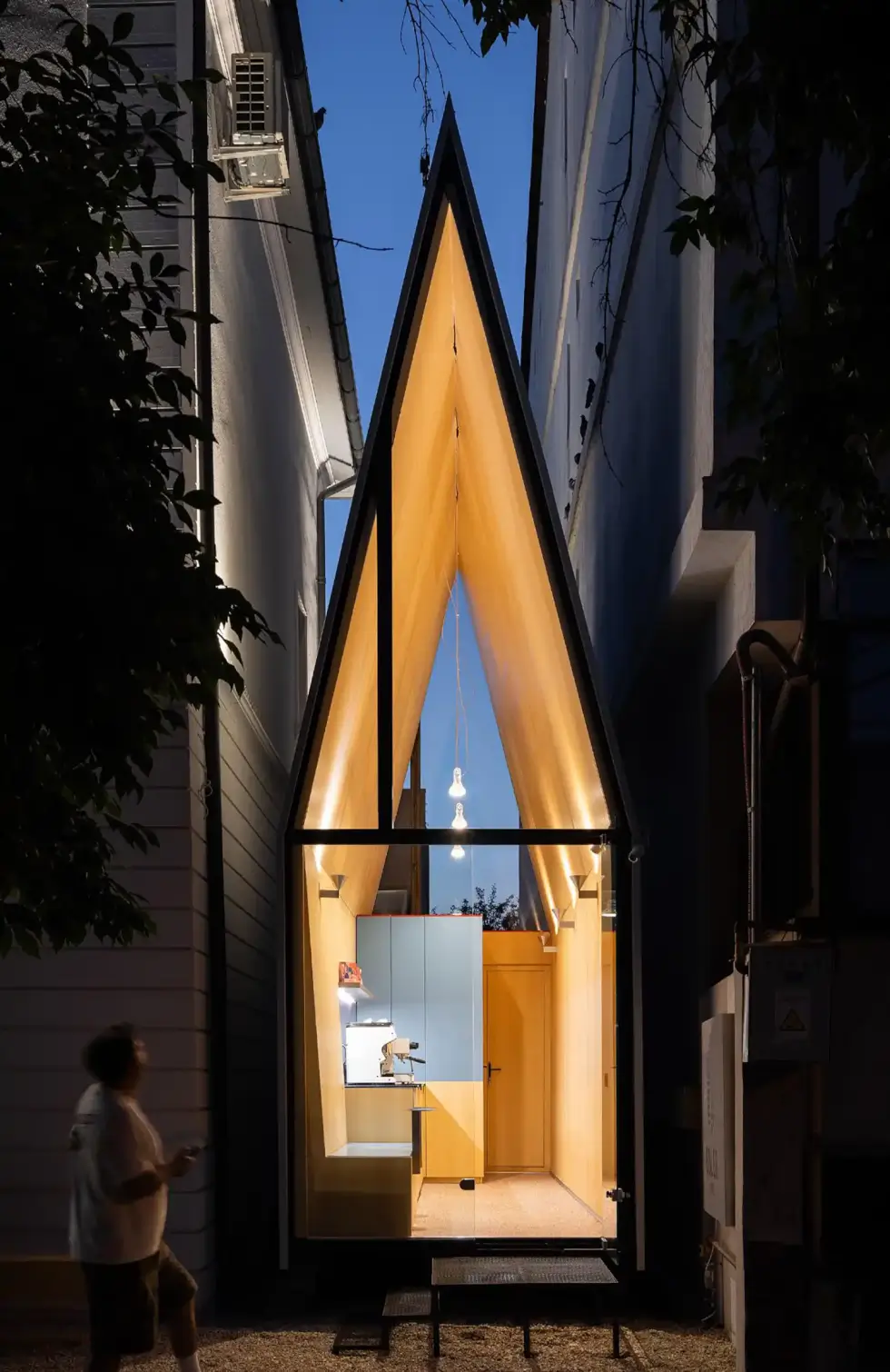 Tall glazing offers seamless indoor and outdoor integration and creates a sense of openness. Moreover, it invites natural light that creates a visual play of light and shadows throughout the day. Vinklu successfully transformed this cramped space into a communal area for city dwellers to converge.