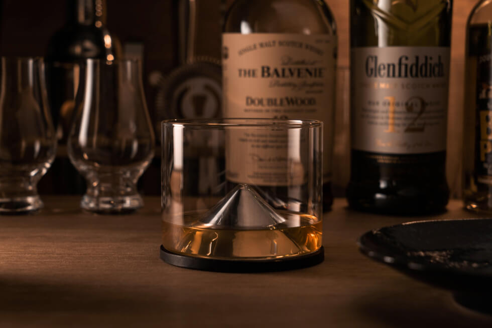 The Chill Tumbler is a perfect vessel for whisky and spirits enthusiasts. Its unique mountain-shaped tumbler glass combined with a stainless steel cooling cone presents a functional and aesthetically pleasing design, which provides spirits lovers an elevated drinking experience.