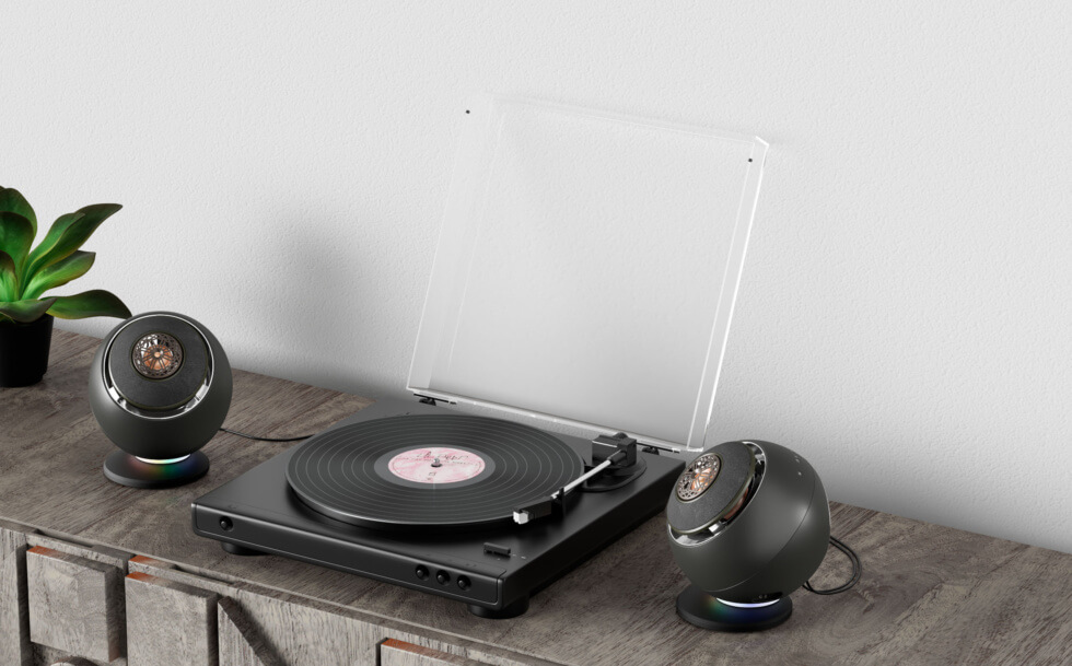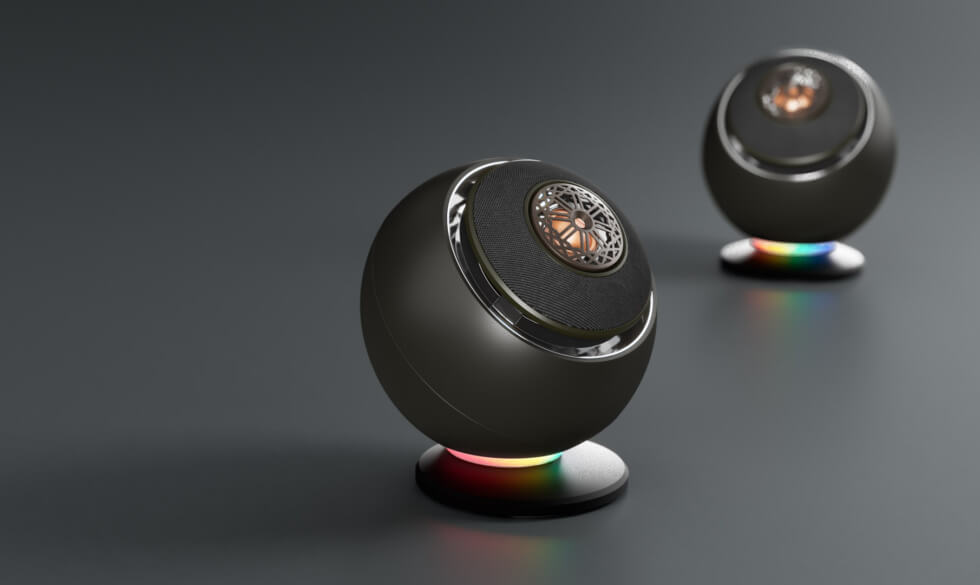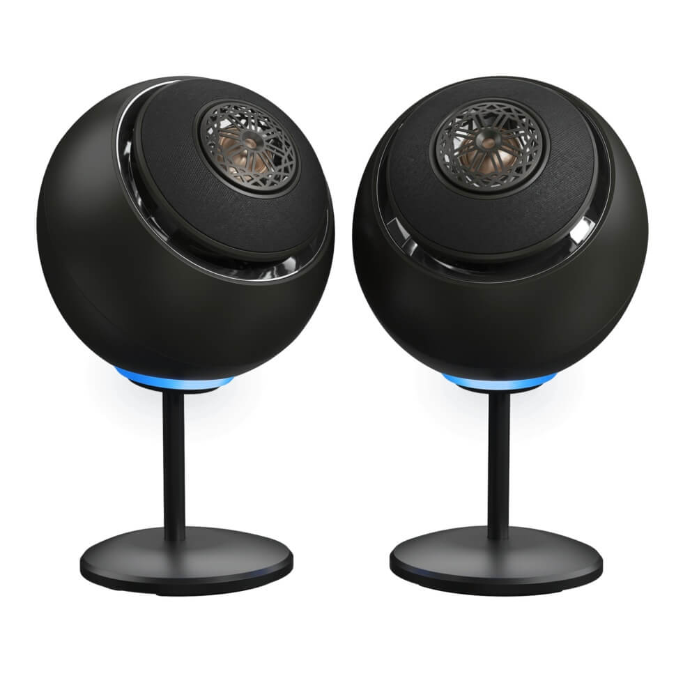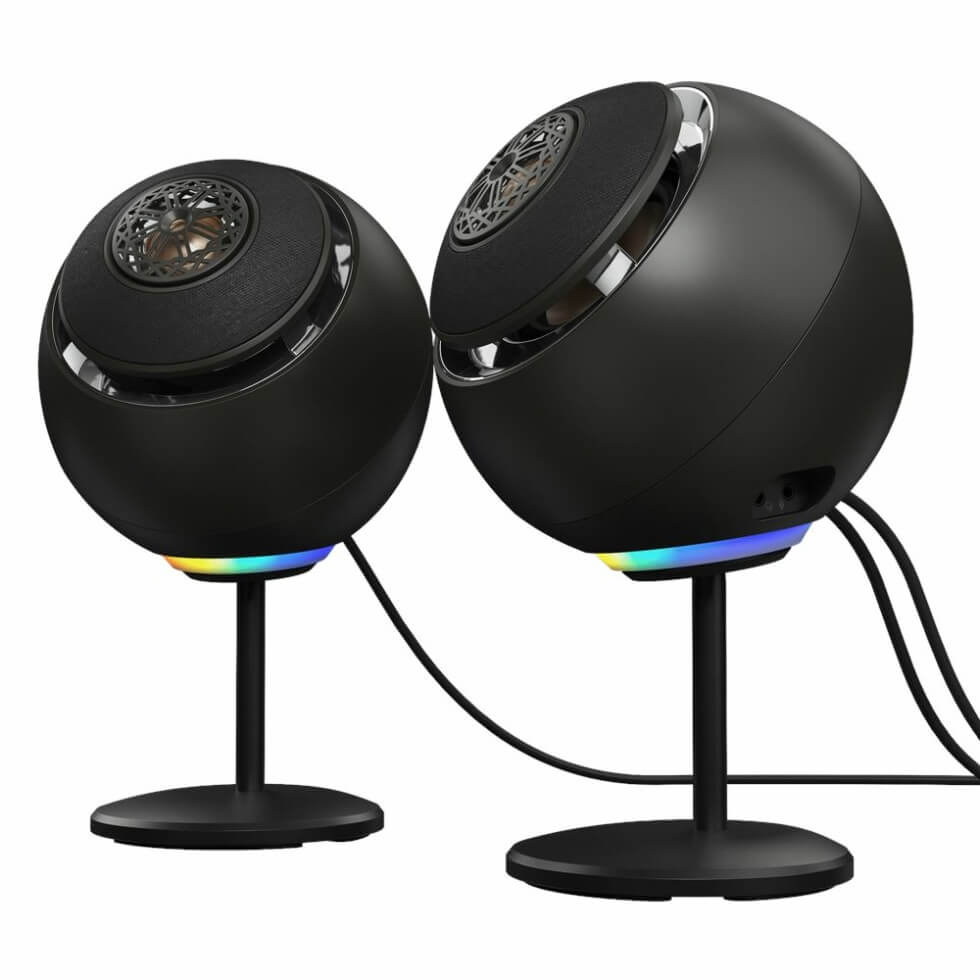 Creative goes for a space-age design with each sphere packing drivers in a coaxial layout. Each unit measures 149.2 mm x 150.8 mm x 153 mm and holds a 3″ driver and 1″ tweeter with a passive bass radiator. These are arranged to output sound at a 45-degree angle to directly send them to the listener’s ears.
