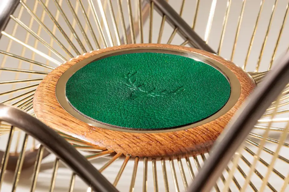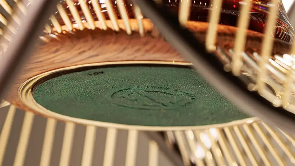 Dobbin applies his renowned discipline to craft the pedestal out of Scottish brown oak, bronze, and brass. There is also a round green leather liner on the base, embossed with The Dalmore’s 12-point Royal Stag emblem.