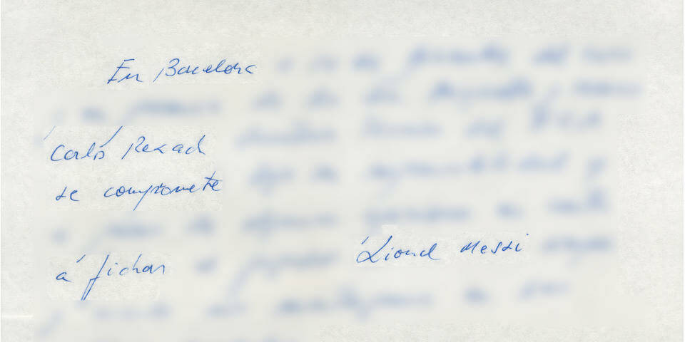 The agreement on The Famous Napkin is written in Spanish but translates to: “In Barcelona, on 14 December 2000 and in the presence of Messrs Minguella and Horacio, Carles Rexach, FC Barcelona’s sporting director, hereby agrees, under his responsibility and regardless of any dissenting opinions, to sign the player Lionel Messi, provided that we keep to the amounts agreed upon.”
