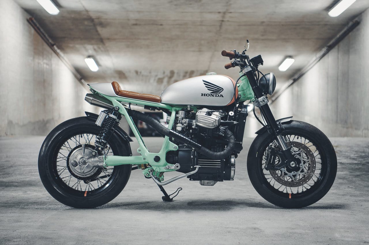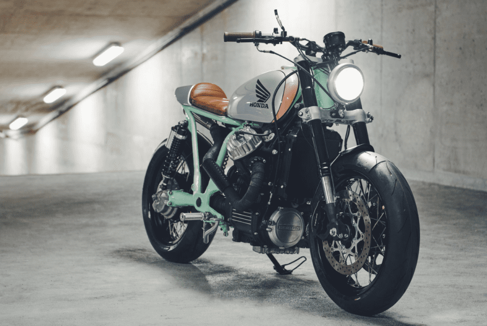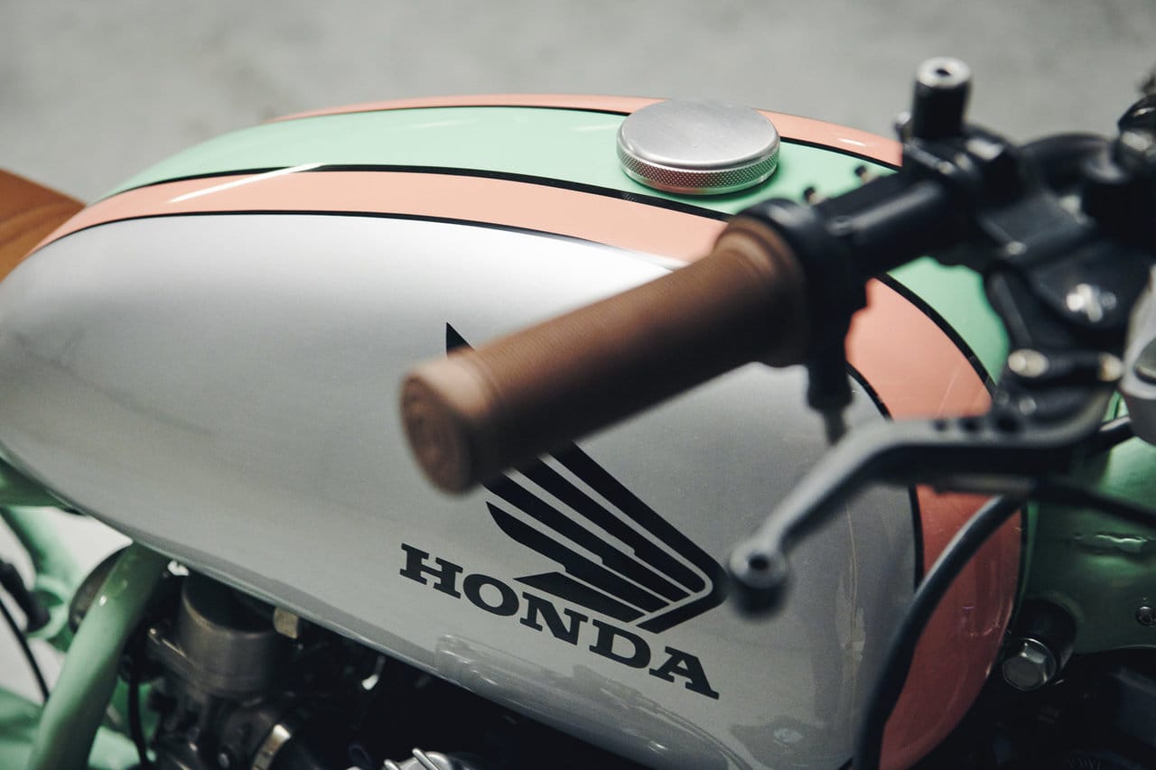 According to sources, this unique project takes 1983 Honda CX650, which saw a limited release period in the United States. Michael Muller helms this project and the resulting ride looks fantastic with its mix of peach, white, and mint paint job. There’s also splashes of chocolate brown, which adds a playful accent of colors on the grips and leather seat.
