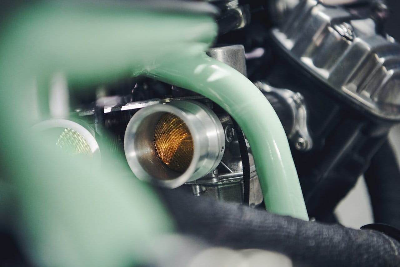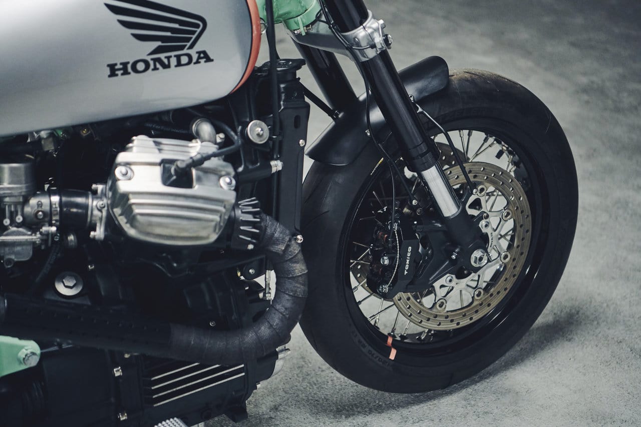 Viewing the bike from the front, you have anodized black forks taken from a 2006 Suzuki GSX-R600 as well as the brakes. Meanwhile, the rear is sourced from a 1988 Honda Shadow to complete framework. You also have a pair of Buchanan Spoke & Rim 17-inch Sun aluminum wheels with Metzeler Racetec RR tires.