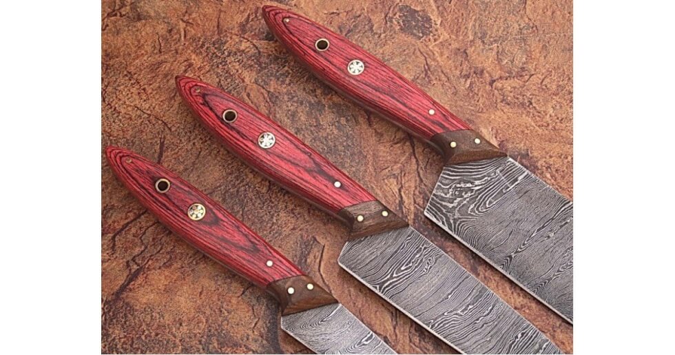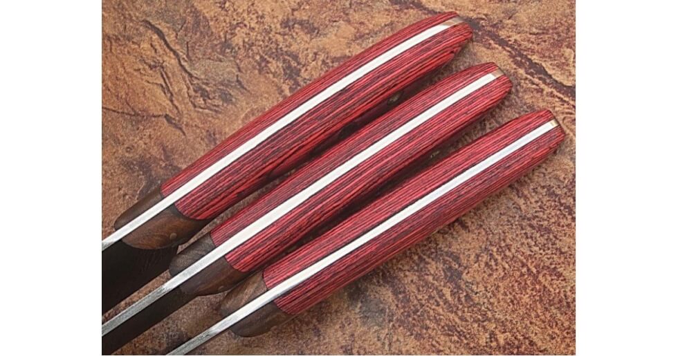 The set comes with three knives with blades all forged from Damascus steel bolt-molded unto Red Pakka wood handles. The sizes differ in each knife with the longest (including the handle) measuring 13 inches long and the two others at 11 and 9 inches. The 13-inch knife comes with a 7.5-inch blade and a 5.5-inch handle. The 11 inches kitchen knife has a six-inch blade and 5-inch handle whereas the 9 inches features a 4-inch and 5-inch blade and handle, respectively.