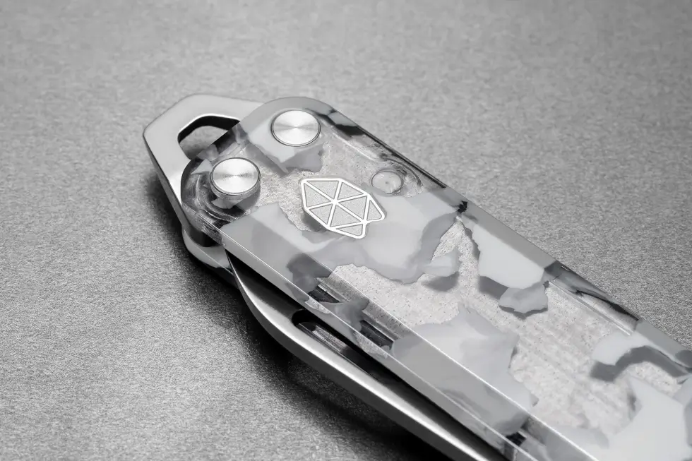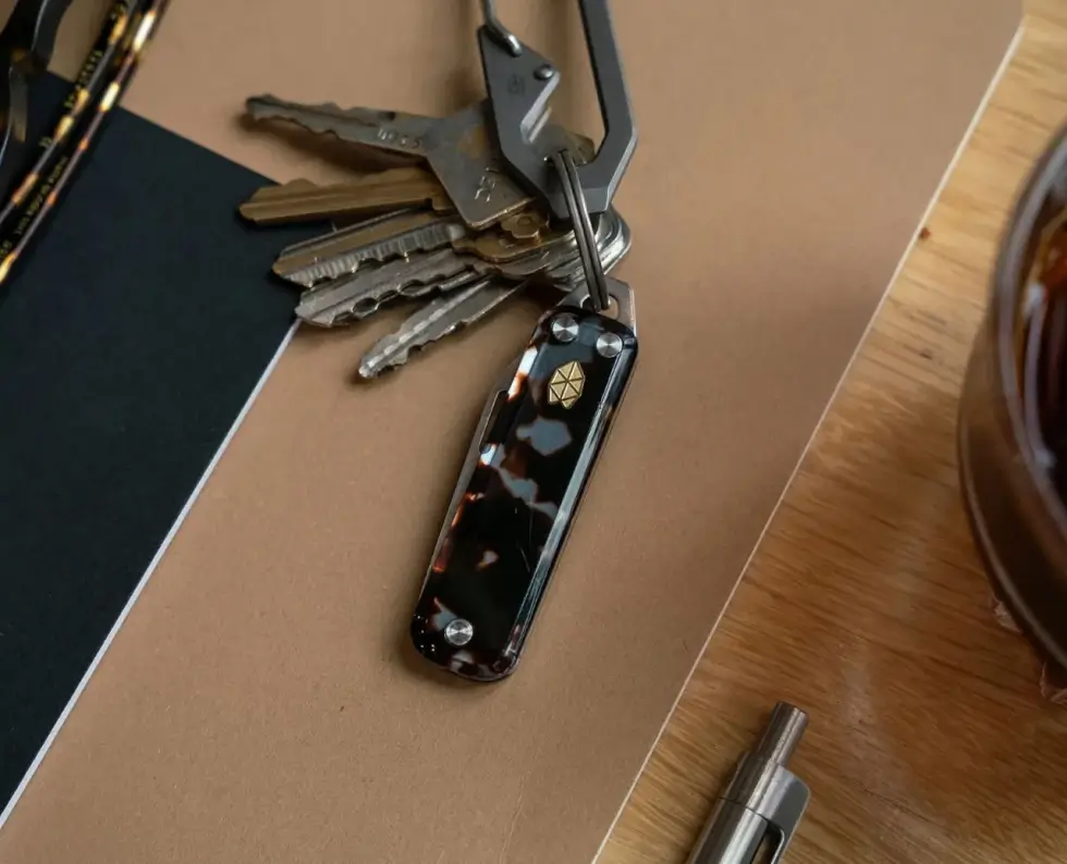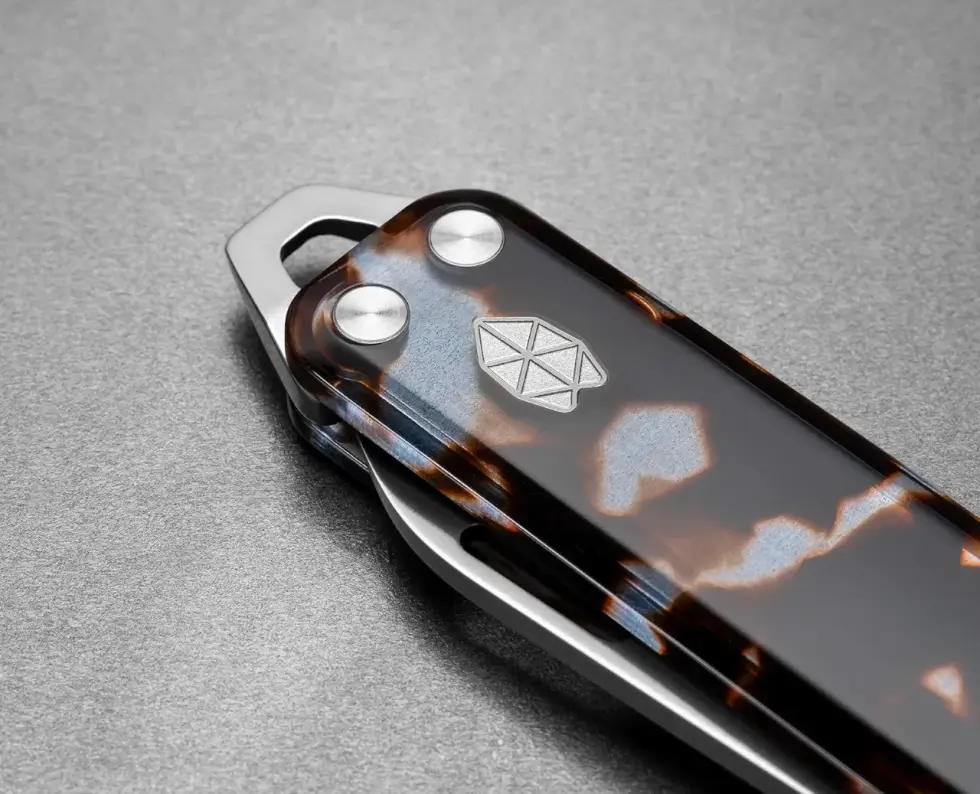 Aside from the acetate handle, this pocket knife also features a Sandvik 12C27 steel drop-point blade. It also comes equipped with a bottle opener, screwdriver, pry tool, and a pry bar that doubles as a key ring.