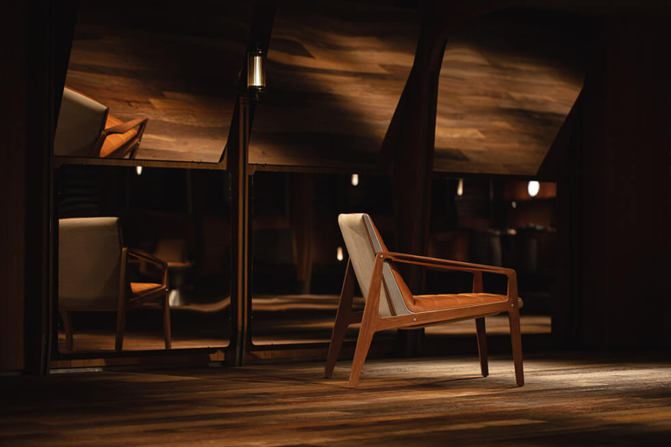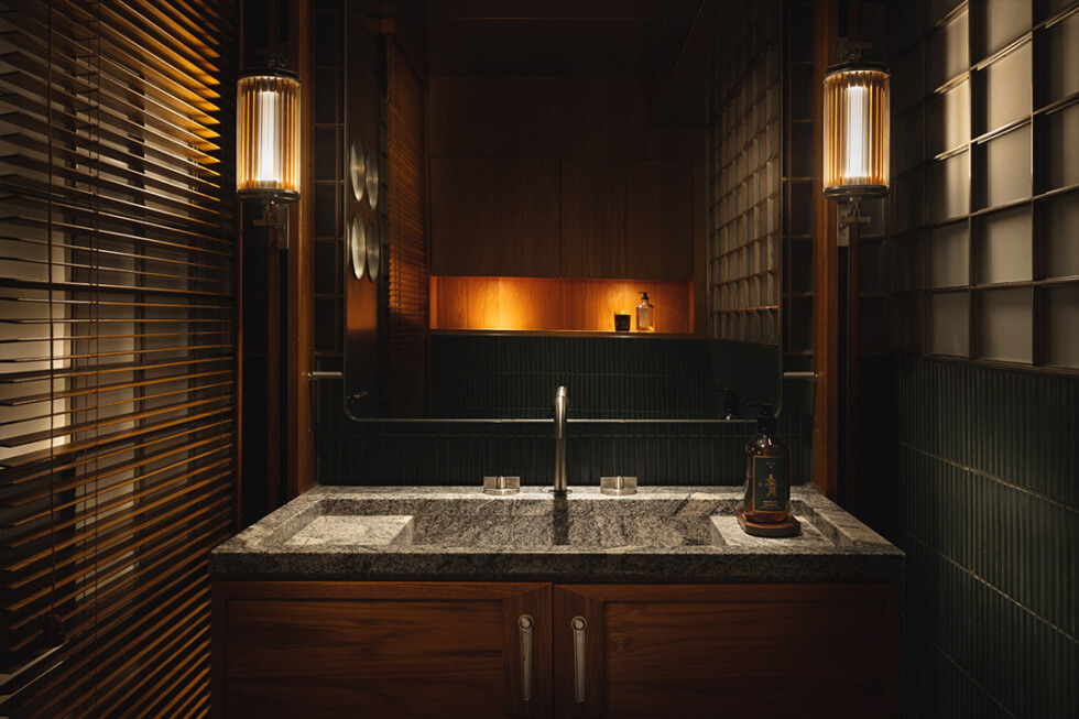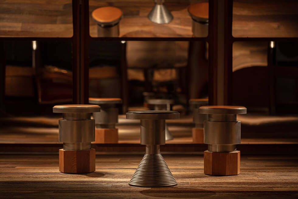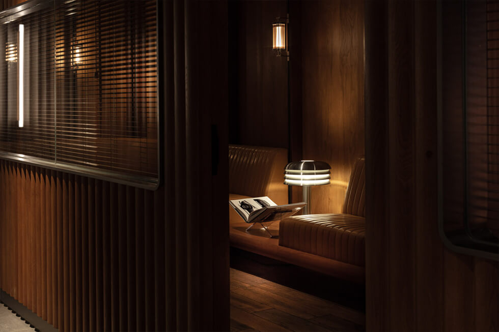 According to A Work of Substance, the lower floor touts a 1950s theme. You can see it on the stainless-steel car elevators, concrete walls, a 10-foot-wide ceiling fan, and timber cladding on various surfaces. Meanwhile, the upper floor of The Library opts for wooden elements.