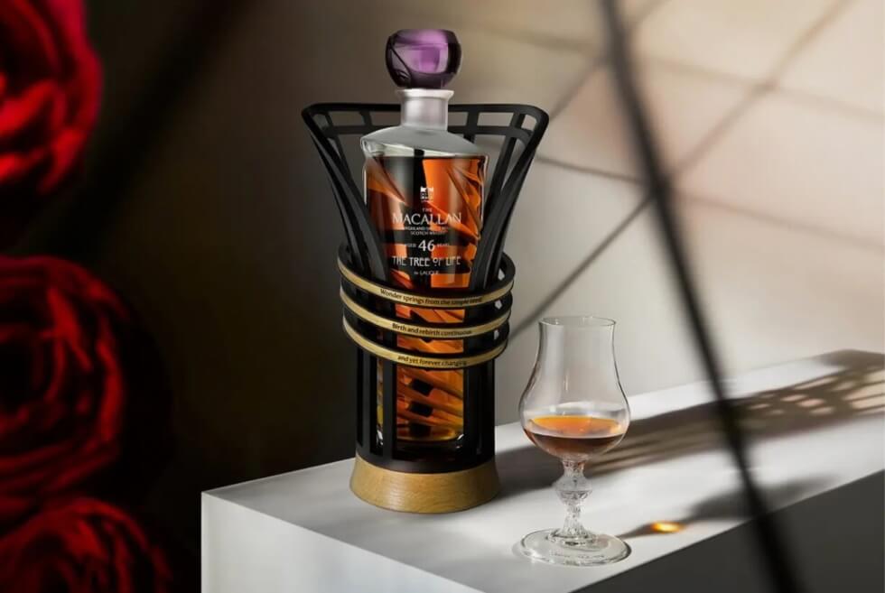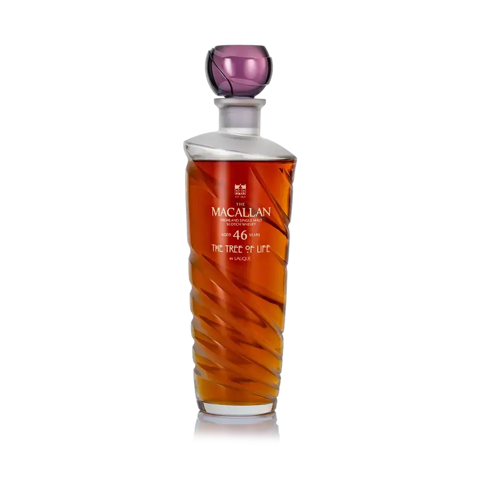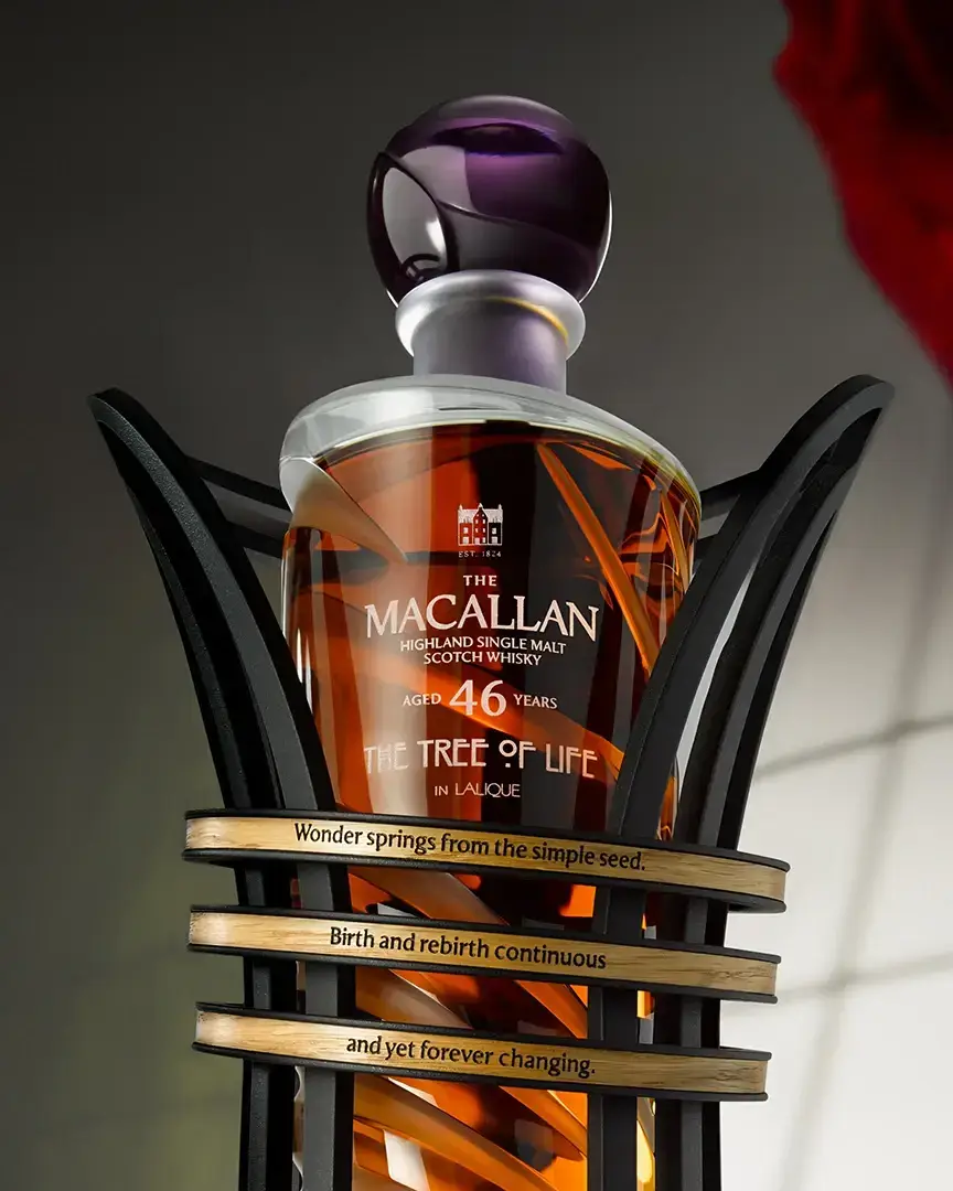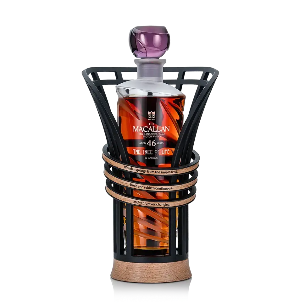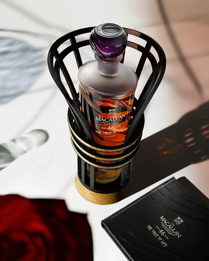 Just like every other exclusive production, The Tree of Life ships in a bespoke Lalique crystal decanter with a crystal rose stopper. Its outline is apparently a tribute to the “intricate metalwork,” which is a signature decorative element by the architect/designer.