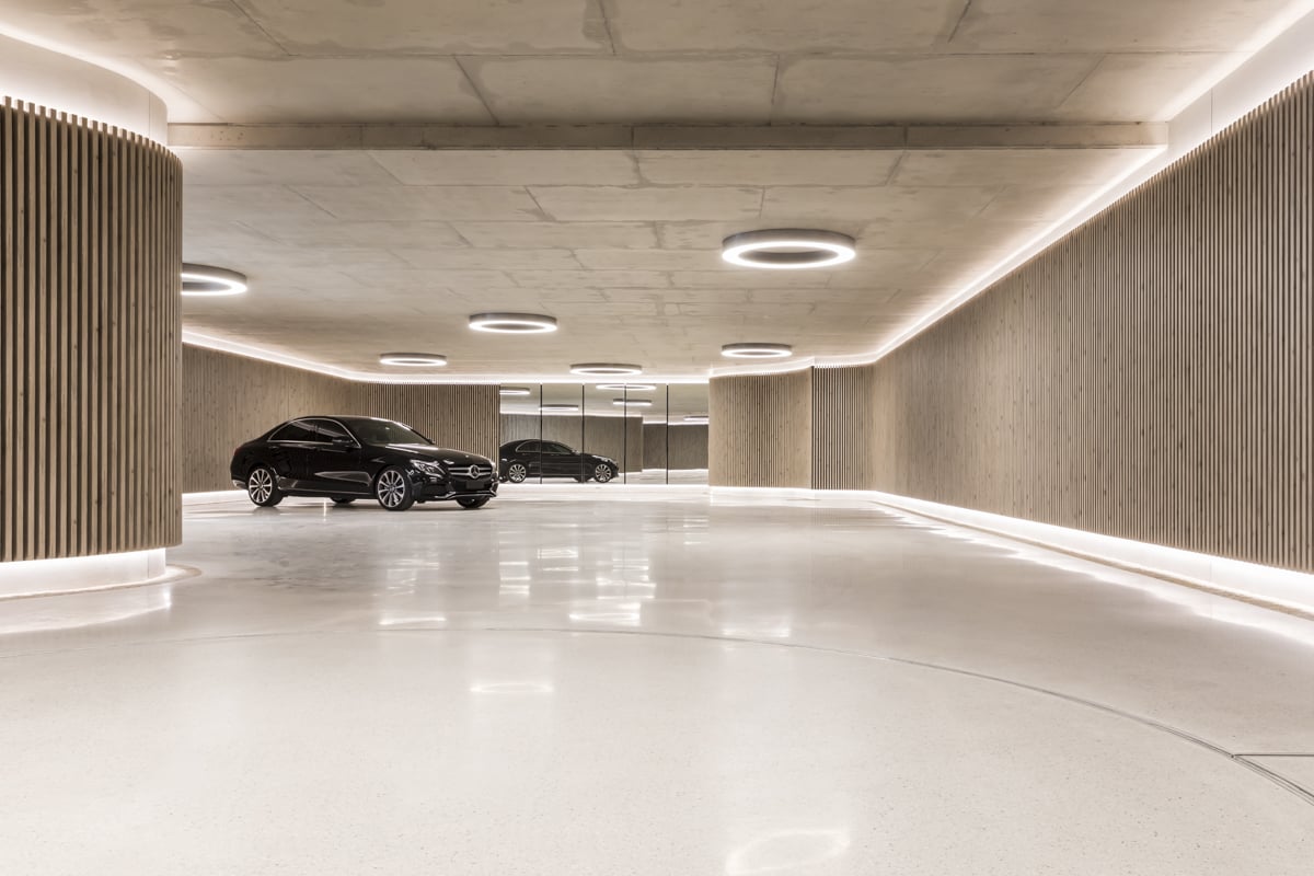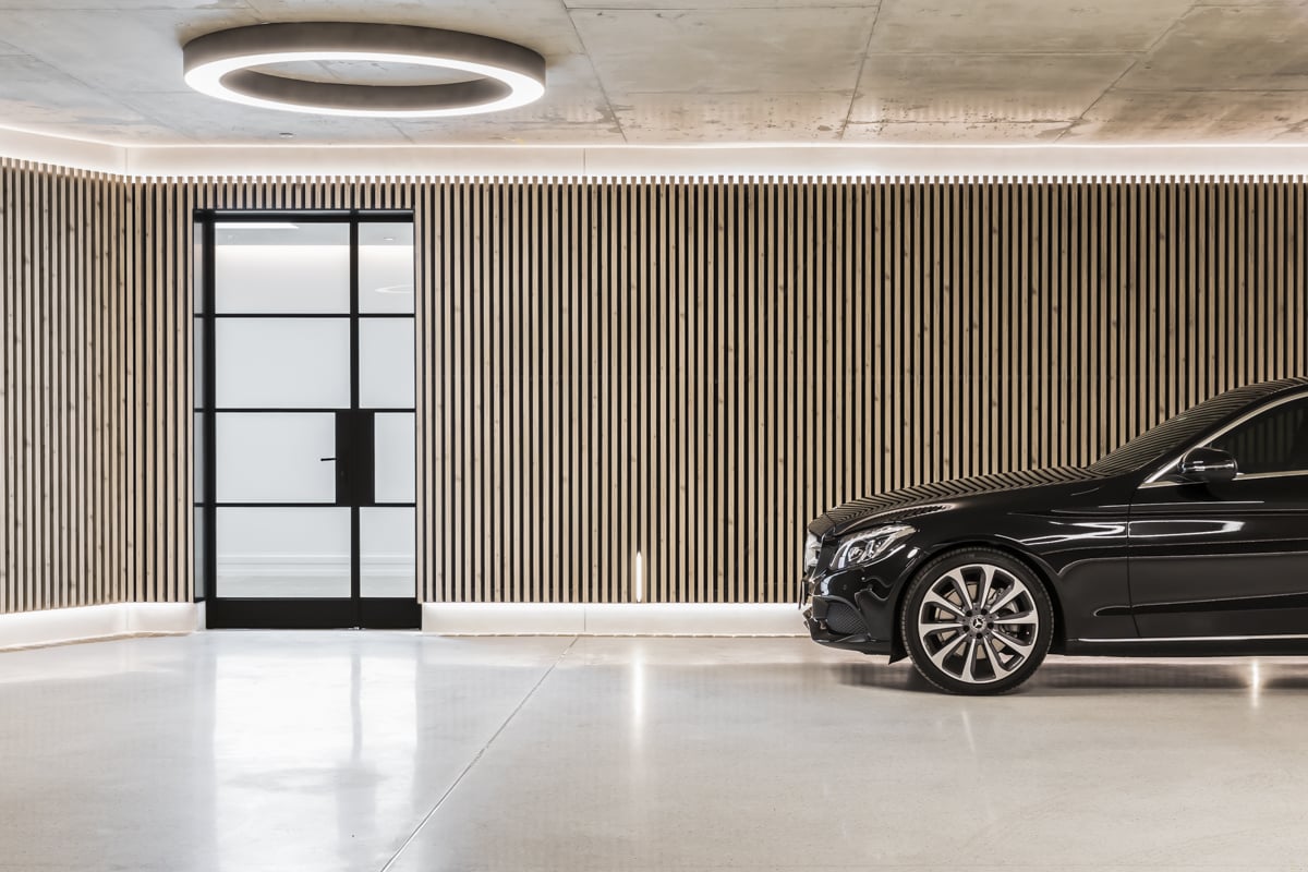 Kent fit in LED lighting behind the battens and along the skirting. She also put in vertical market strips to mark off parking bays for five cars. This lighting setup tiptoes the line between subdued and showy, generating enough contrast so as to give a bit of texture but not too dramatic as to deride the whole atmosphere. In a word, sublime.