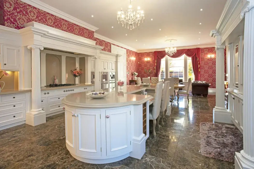 The property has seven bedrooms, seven baths, underfloor heating, double glazed windows, and hand-carved walls made of Derbyshire stone. Aside from an open kitchen, drawing room, and dining room, it also has a gym, a snooker room, a 65-foot indoor swimming pool, and a steam room.