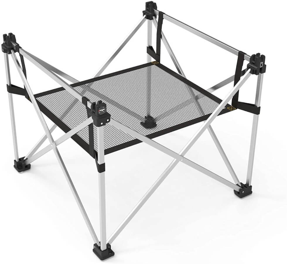Designed for outdoor enthusiasts, this one comes in a portable weight of 2.5kg and a size that can easily be carried on your backpack. It measures 65cm×20cm×12cm when folded and is easy to set up with a simple pop-open method. Its aluminum base makes it easy to attach the tabletop to the legs.