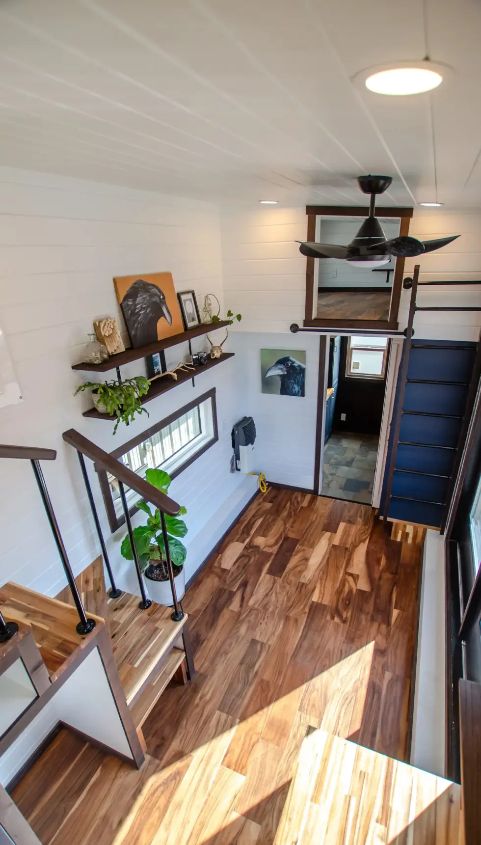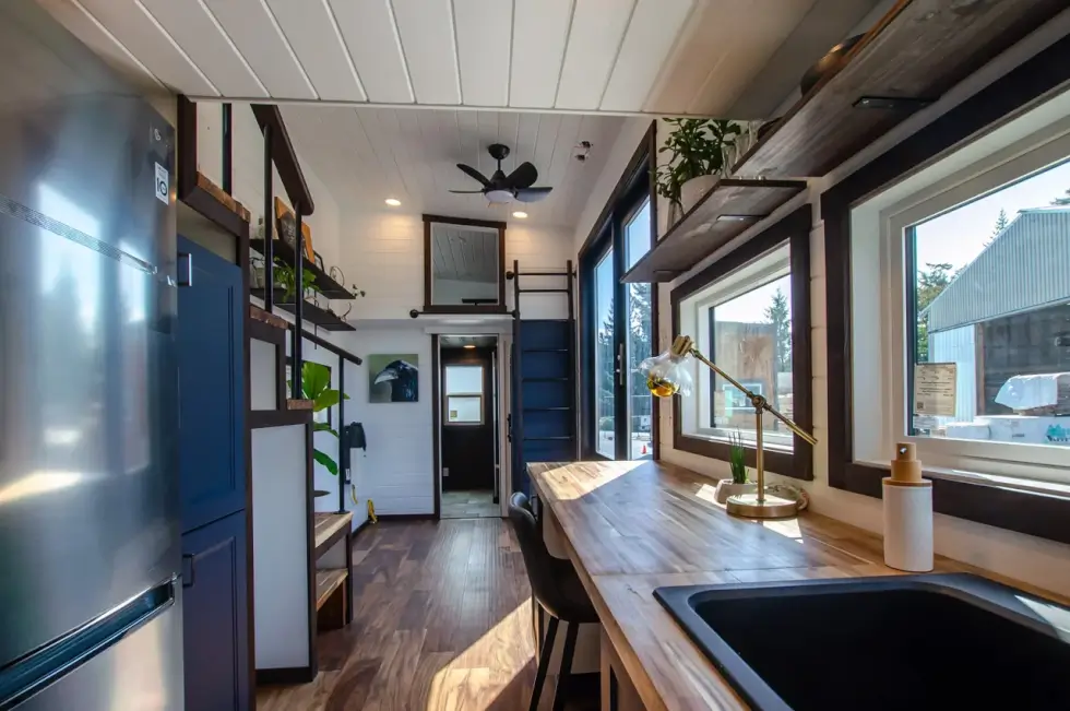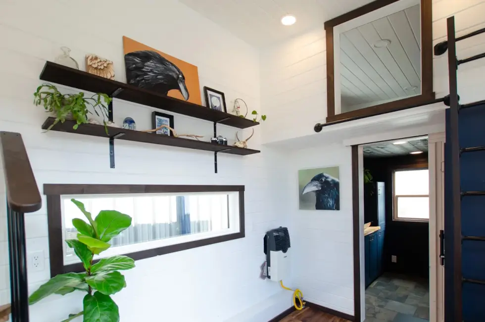 Aside from the glass windows, The Raven uses Philips Hue’s smart lighting and is powered by an EcoFlow solar panel array and a battery setup added by the owners. Likewise, this tiny home uses EcoFlow’s dual-fuel generator which runs on propane or gasoline to power the lights regardless of the weather condition. Wood cabinetry and flooring set against white wall painting opens the space, making it look inviting and spacious.