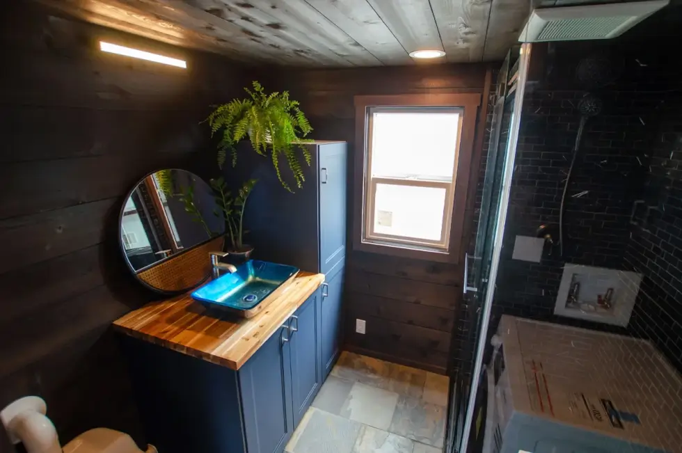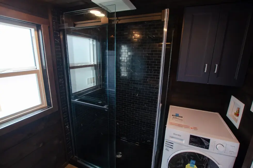 Meanwhile, the bathroom is located at the far end and it is quite spacious for a tiny home. It has a shower, a composting toilet, a washer/dryer, and a sink with mirror. Glass windows provide natural lighting.