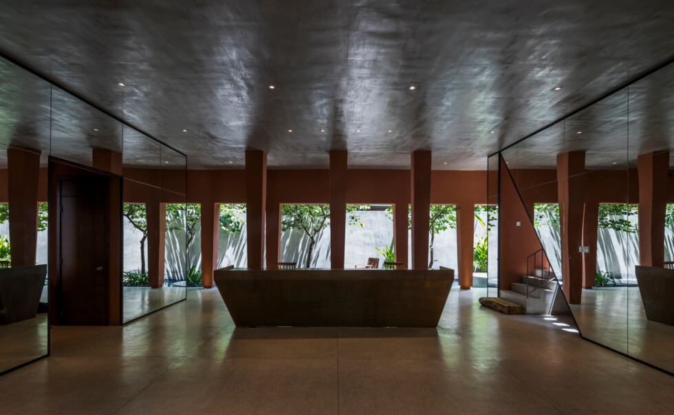 The Red Cave occupies an area of roughly 3,875 square feet and spans three levels. Let’s start with the ground floor which features a huge open space with pillars framing the walkways. Watch your step because a water channel surrounds the edges. The volume within is an open-air gym with various exercise equipment.