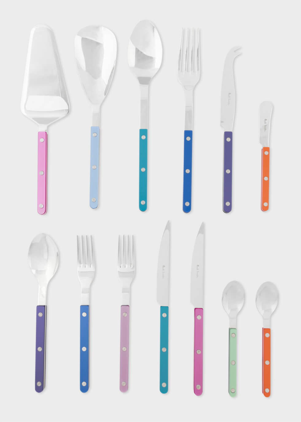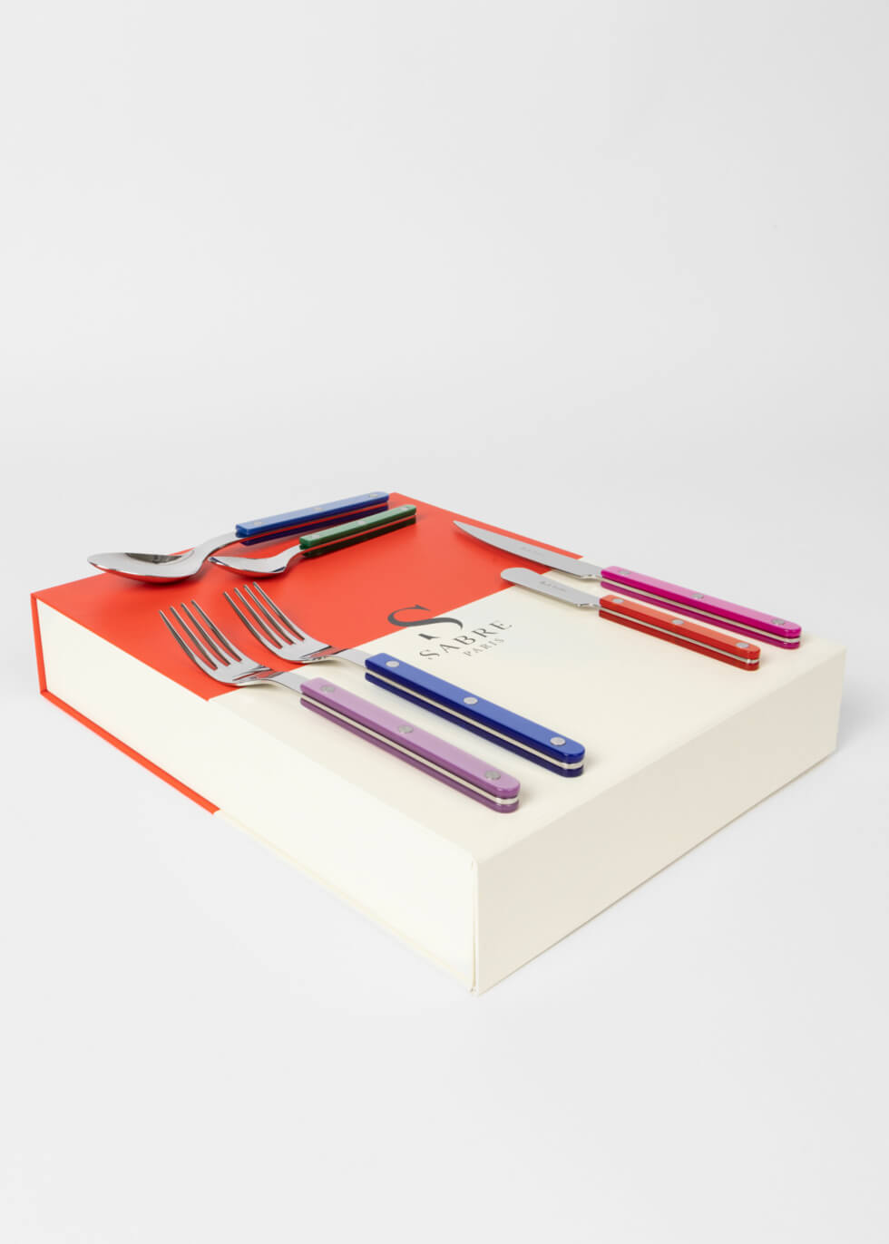 The 22-piece set includes a cheese knife, butter spreader, serving fork, tart slicer, rice spoon, and four for each table knife, spoon, teaspoon, and table fork. Meanwhile, the two sets of the Sabre + Paul Smith – Rainbow 4 Piece ‘Bistrot’ Cutlery Set comes with a spoon, table fork, table knife, and teaspoon complete with Paul Smith engraving on the knife spine and Sabre engraving on the neck of each piece. The Sabre + Paul Smith Cutlery Set also comes in Ivory and Orange colorways.