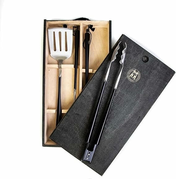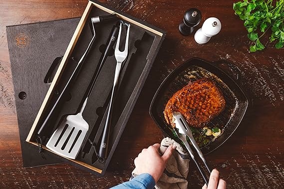 The set packs four indispensable tools every pit master needs. These include an 18″ long two-prong fork, a removable, silicone-tipped basting brush at 18.6″ long, 17.3″ long tongs, and an 18.8″ long spatula all forged with high carbon 100% German stainless steel. These tools are made to last, boasting premium grade materials designed for maximum comfort.