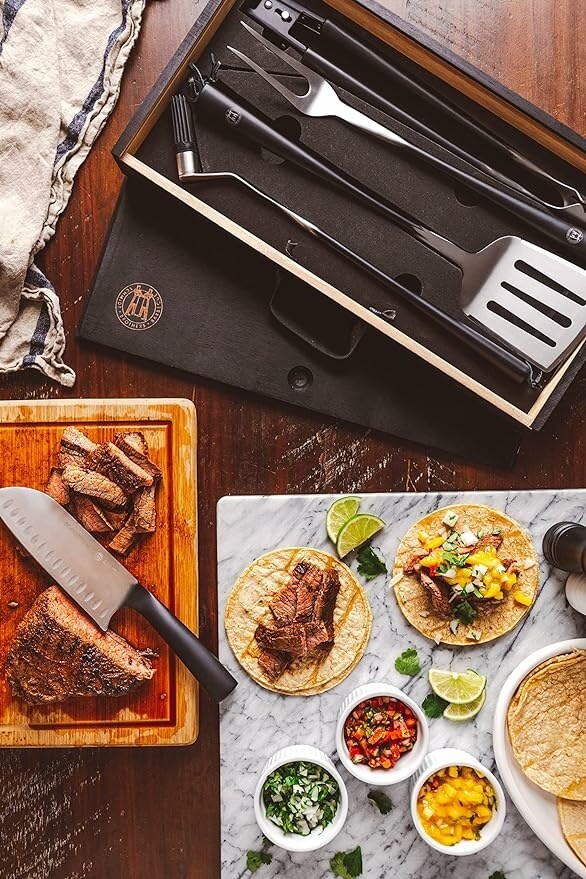 The Schmidt Brothers Carbon 6 BBQ 4-Piece Grill Set makes a perfect gift. Its stylish, durable, and a high-gauge stainless steel design promises to be the last set of grill tools you will ever need.