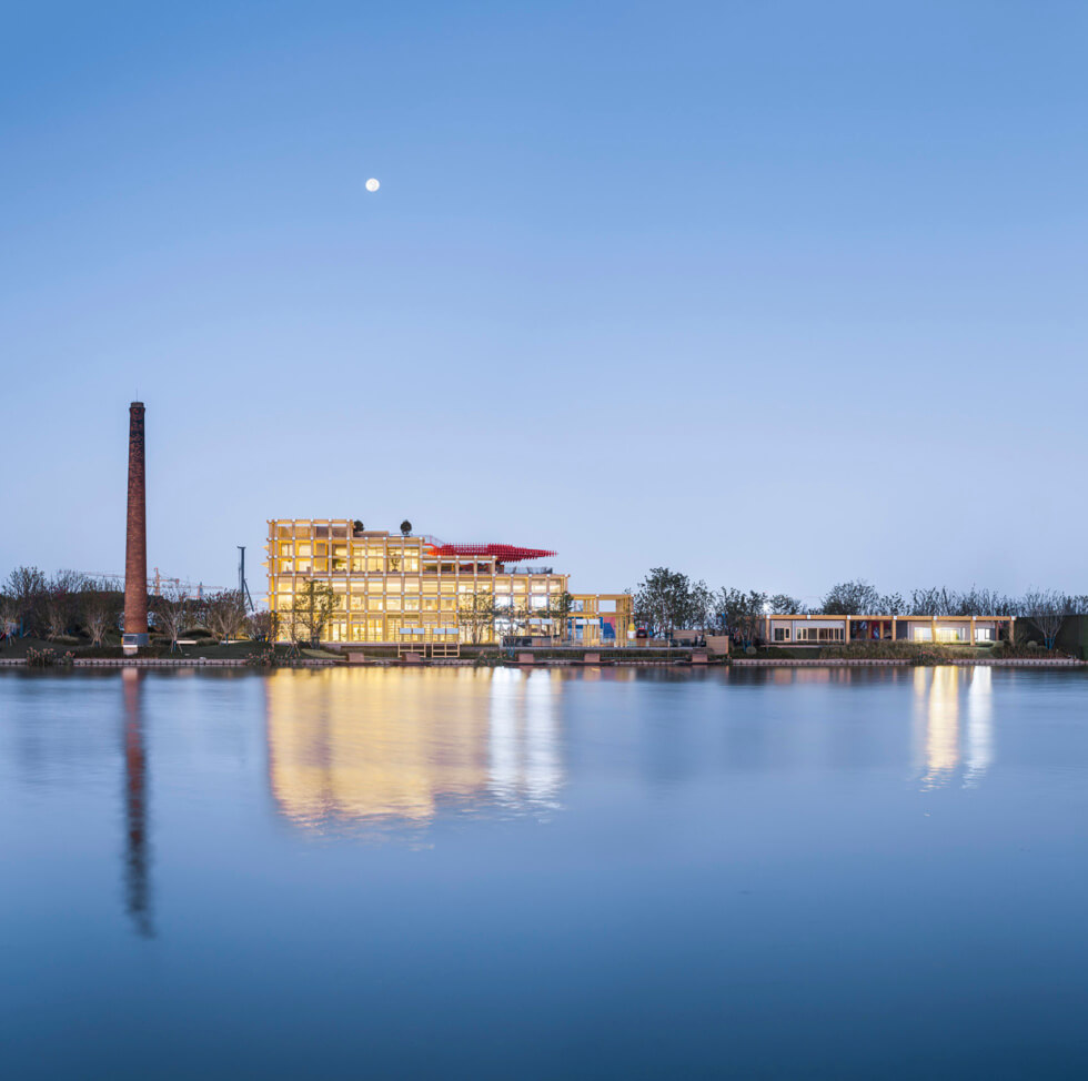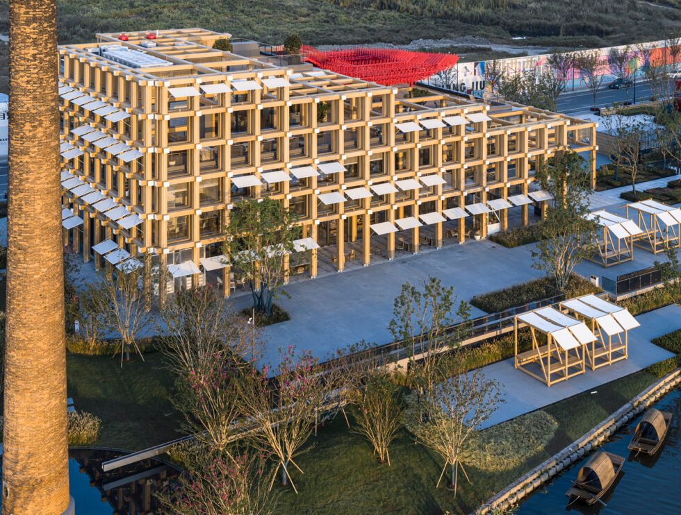Located in the town of Dongpu, where most of China’s and the world’s Shaoxing wine comes from. The site was originally one of the many workshops that produces the drink/cooking ingredient. The architects attempted to preserve some of the structures around it which is why you’ll see the red brick chimney still standing.
