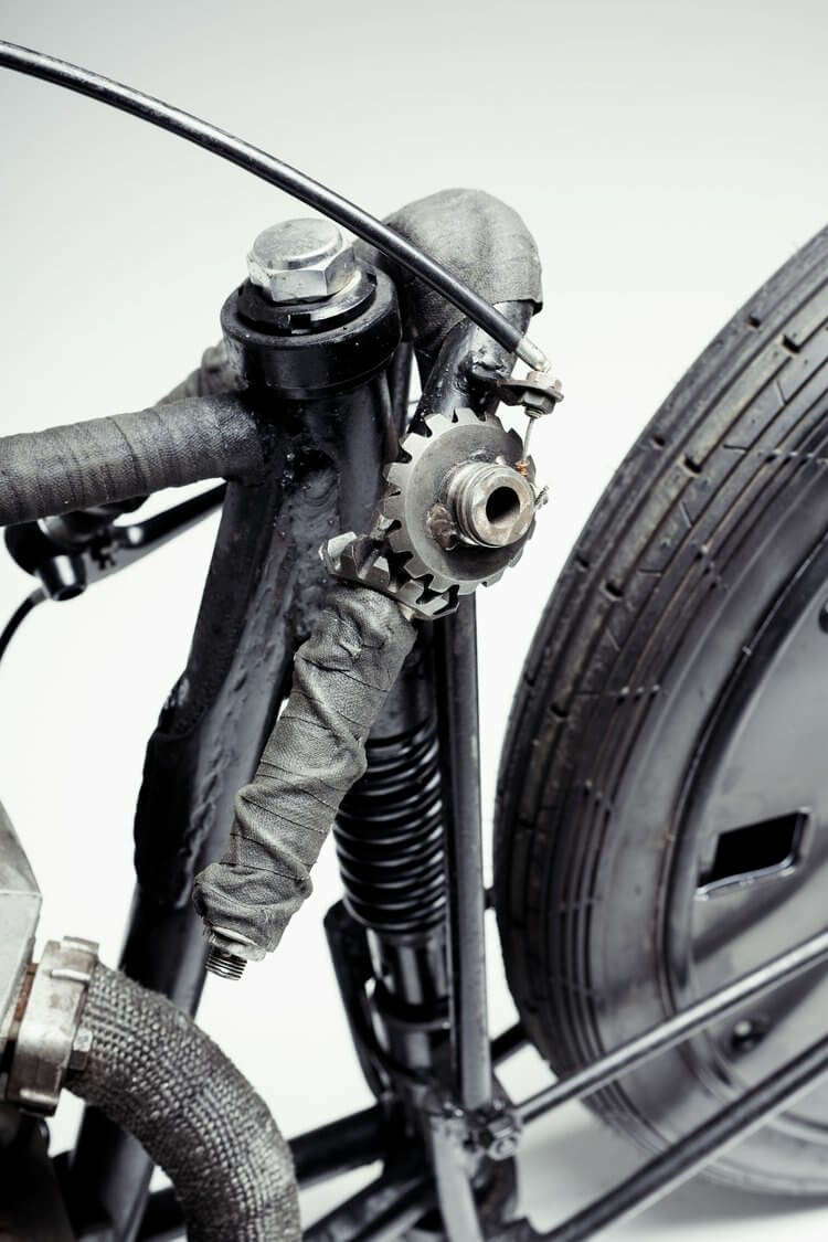 Contemporary upgrades include a velocity stack and an underslung exhaust system. Many will notice the negative space above and below the top tube. Instead of a standard tank or its placement, Zhao equips it to use 17-ounce aluminum bottles that slot just behind the seat post. The Sprinter is also outfitted with a hub-steering setup.