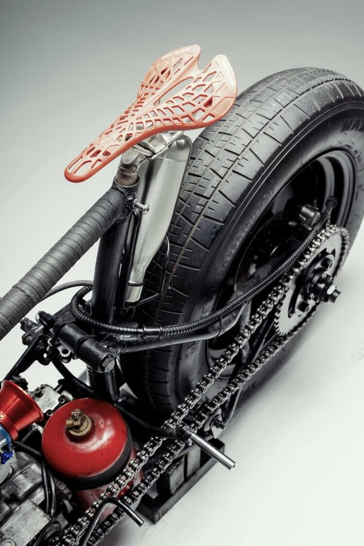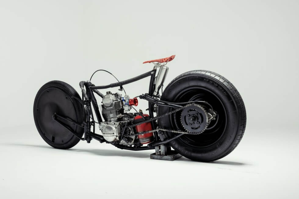 To smooth out its ride over various surfaces, we spy custom shocks on both ends of the bike. Next, the drop-down handlebars, custom saddle, and foot pegs suggest an aggressive riding position. What do you think of The Sprinter? Is it something you’d like to take for a spin, or maybe just stay away from? We think it should remain a showpiece.