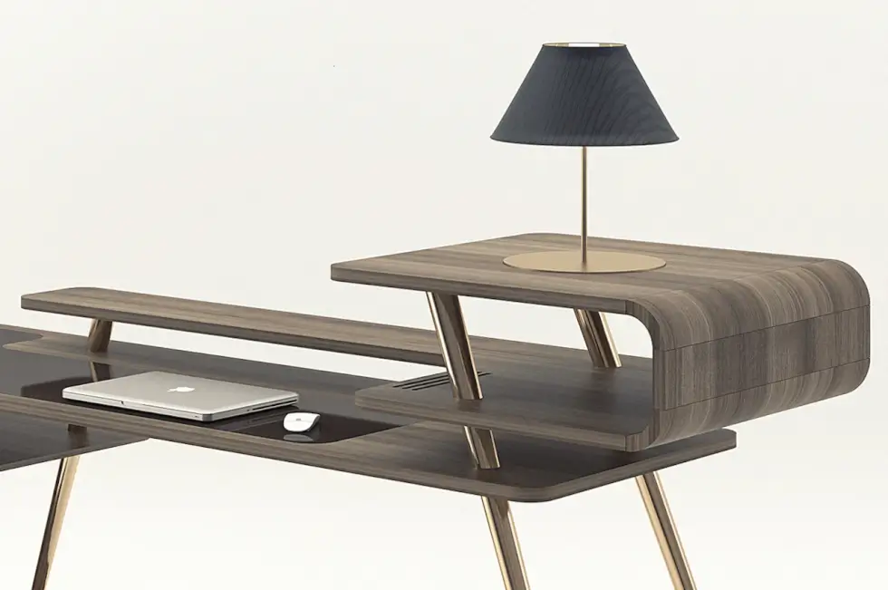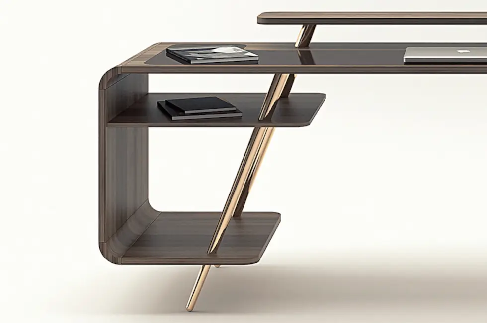 The Table is a humble piece of furniture that boasts a classic design but with a modern twist. It makes a great addition to your work setup or even in the living area. It boasts four diagonal legs in shiny gold that make a beautiful contrast to the woodwork. They add visual delight as they appear to pierce the wood panels.