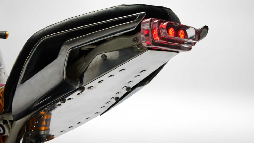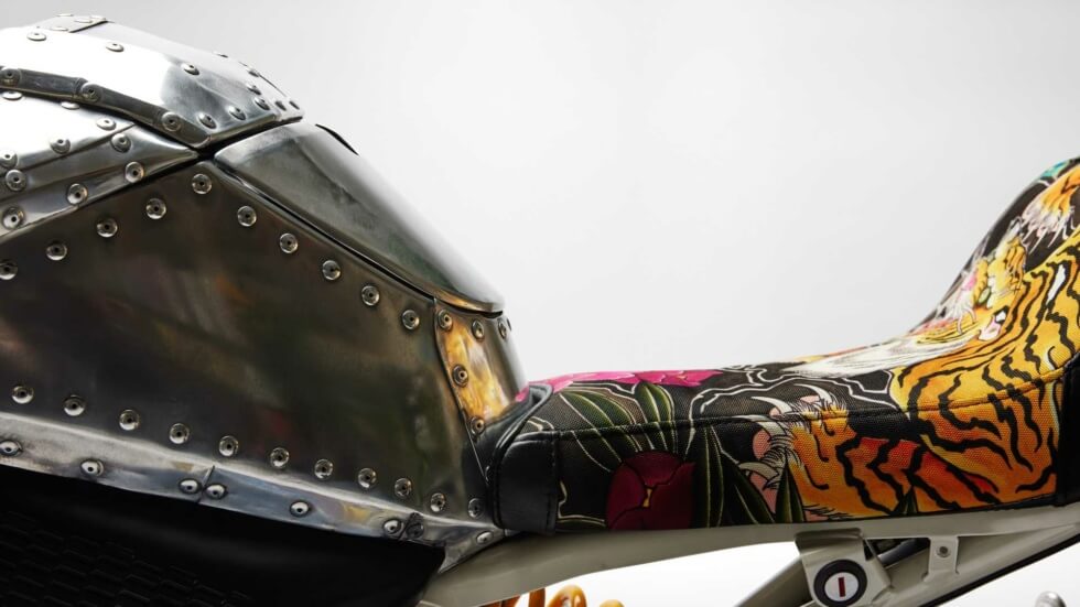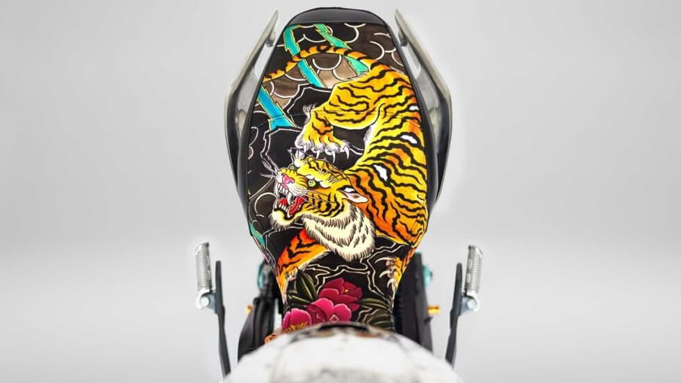 This feature stands out due to a particular characteristic of the said two-wheeler. Given that it runs on batteries, it seems odd to have this. Nonetheless, it’s purely for aesthetics only. The next notable visual element is the seat which features the artwork of a tiger by Portland-based tattoo artist Drat Diestler.