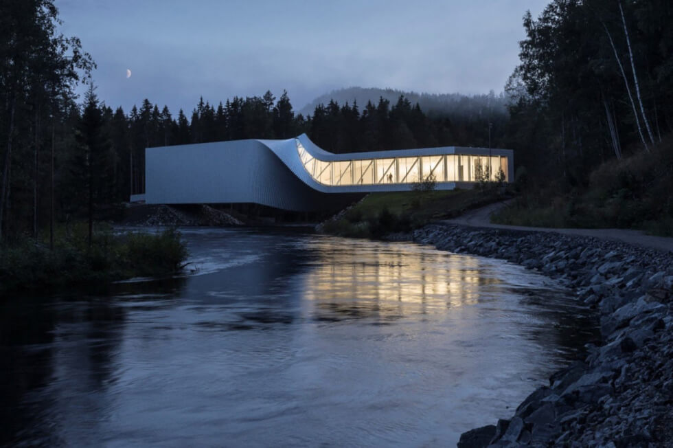 From Bjarke Ingels Group (no surprise, really), this tremendously awe-striking puzzle of a structure doubles as a museum and a bridge. It’s made up of contorting aluminum panels that span the distance over the Randselva River, effectively joining the north and south river fronts of the park.