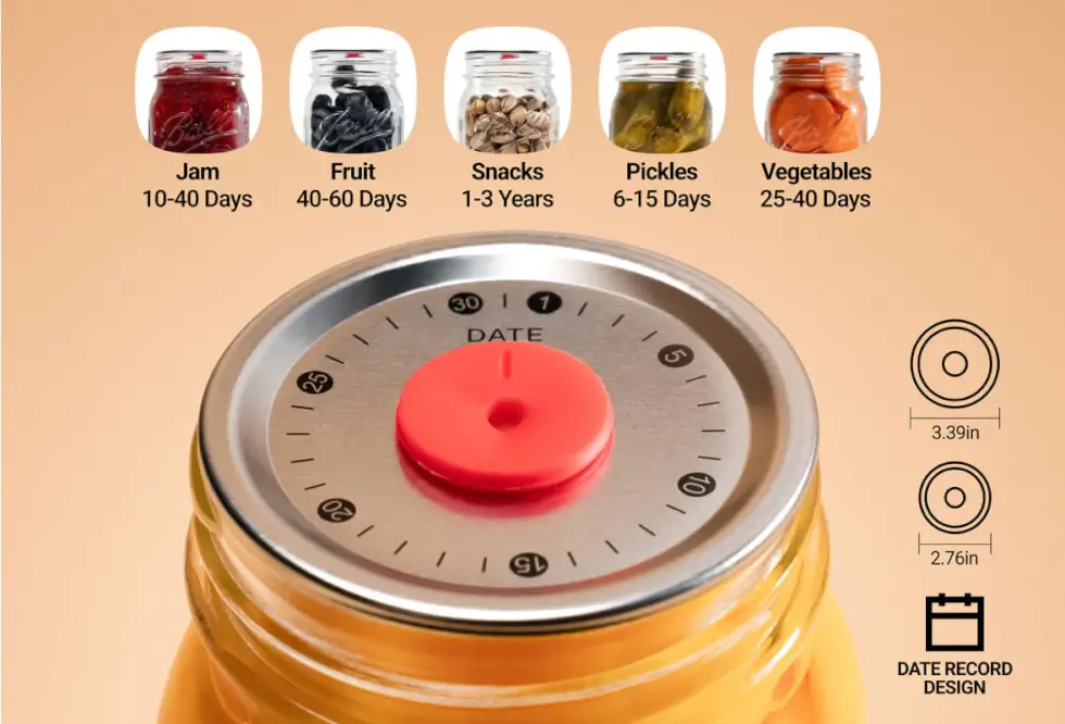 There are ten patented reusable Mason jar lids: five wide-mouth and five regular-mouth. The lids feature a built-in date dial, allowing you to twist the pointer to the storage end date. Then vacuum sealing with this machine is very easy.