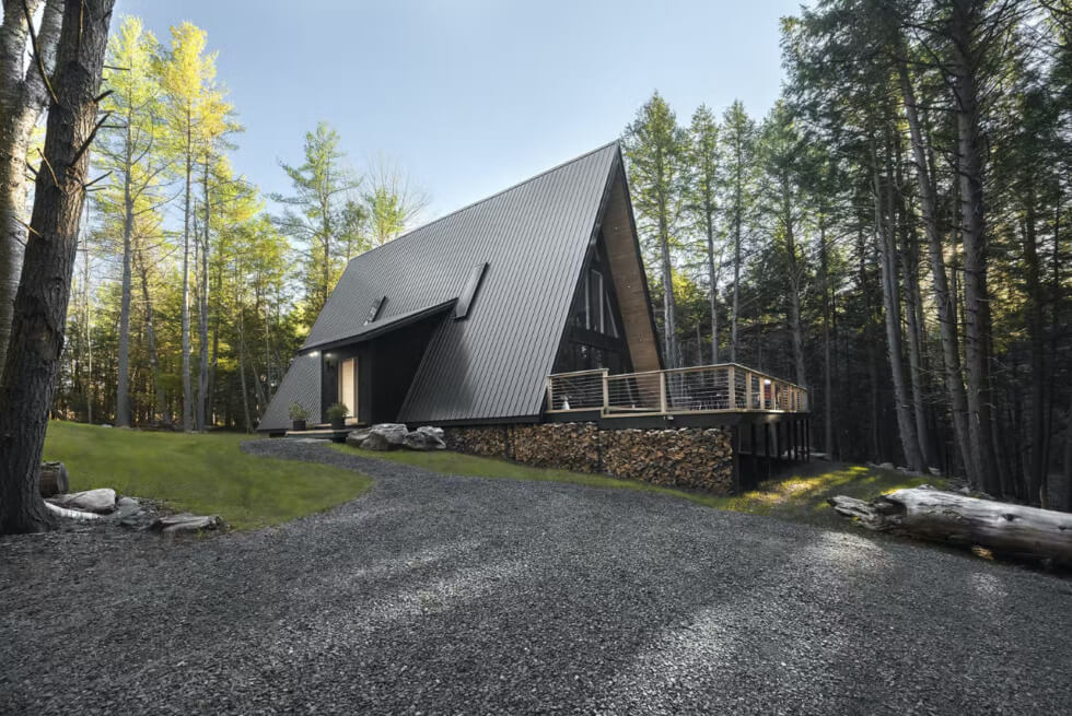 The structure spans 1,800 square feet and stands on a clearing with a perimeter of tall trees. It appears to be constructed mostly out of wood with a combination of steel and glass. The steep outline of its exterior is clad in black corrugated roofing. A cutout makes way for the entrance with its own sloped roof.