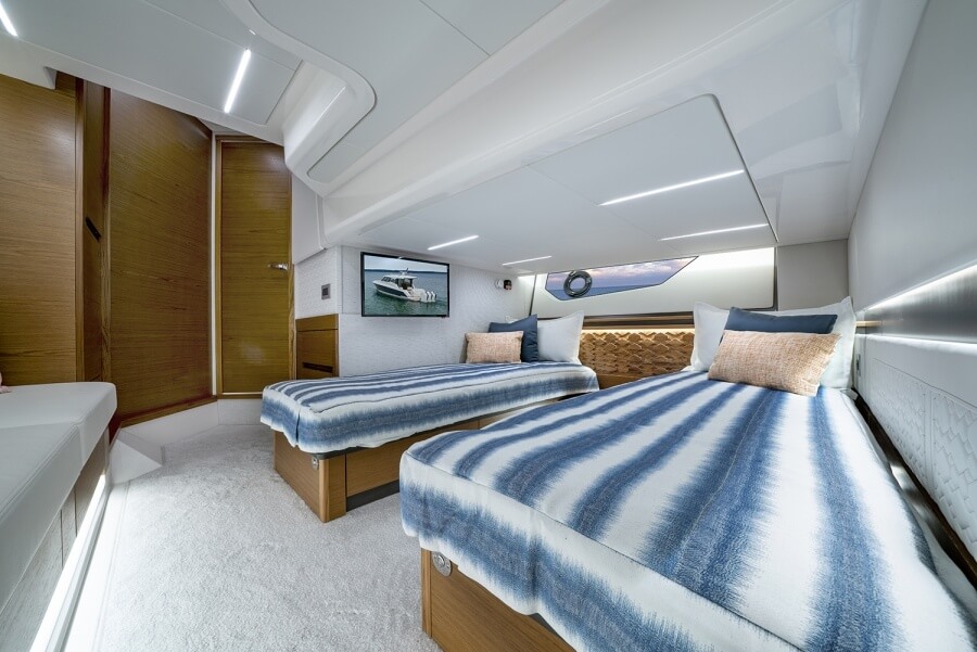 Stairs lead to the lower deck and the full-beam VIP cabin with sliding twin beds for a more intimate sleeping arrangement. “The flagship of our Luxury Express series, the 48 LE is the perfect blend of entertaining comforts and adventure amenities,” writes Tiara Yachts