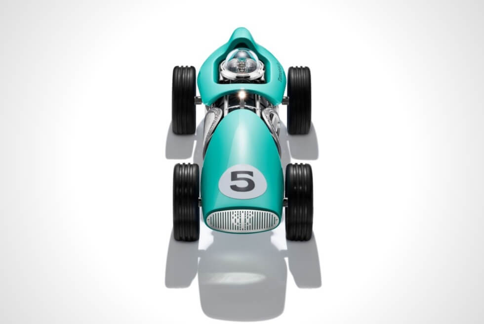 Instead of a traditional dial and hands, it uses barrels with Arabic numerals. At the front is a radiator-style grille with a monogram logo of Tiffany & Co. Meanwhile, the hood shows a white roundel with the number 5 as a tribute to the brand’s Fifth Avenue flagship store.