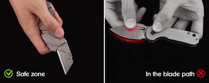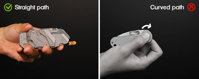 The blade on the SyncraBlade extends on a fixed, linear path, with the rails constraining the motion to keep the blade aligned from start to lock. Moreover, the path of the blade ensures your fingers are safe. The rails guide the motion to keep your grip secure and your hand in a controlled and safe zone.