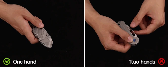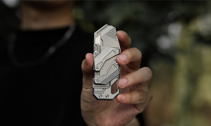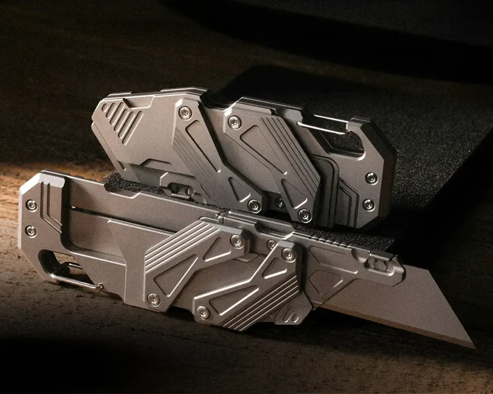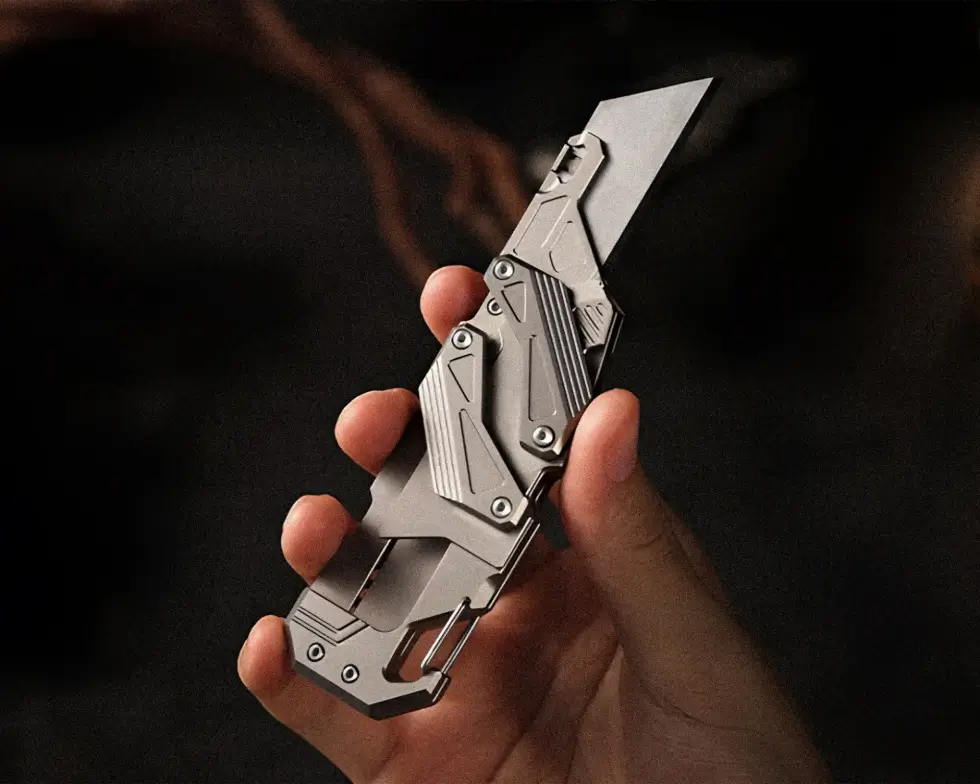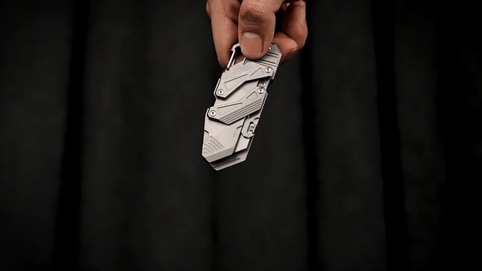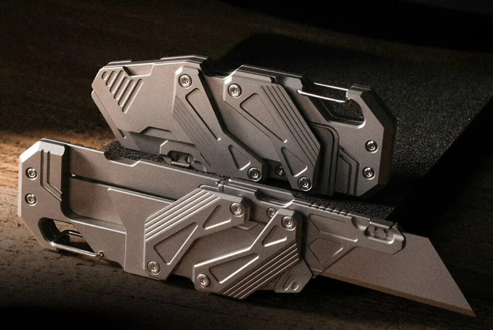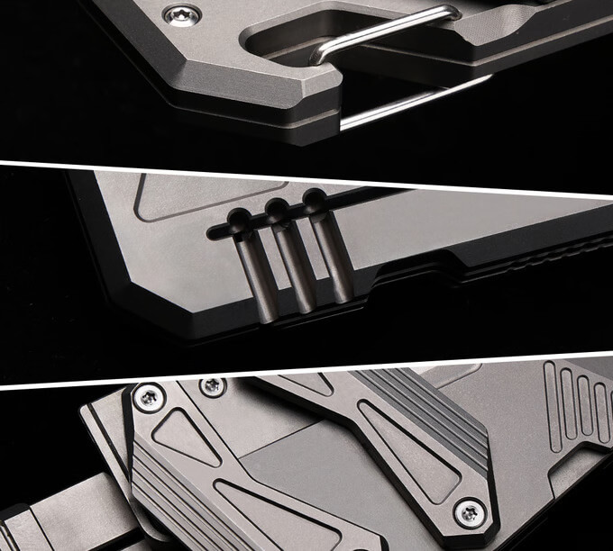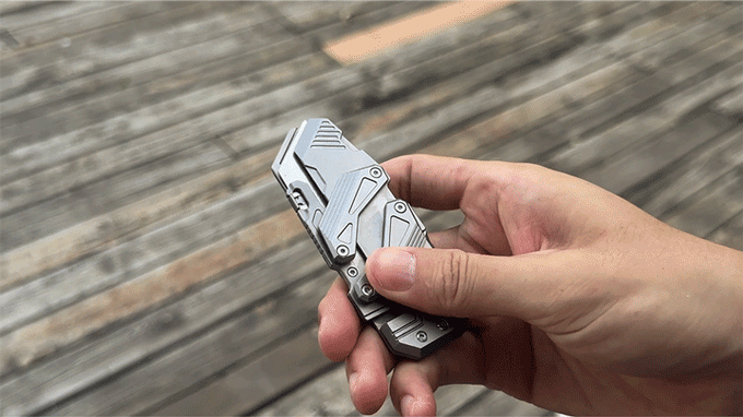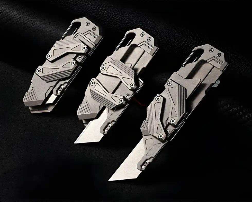 This titanium slide-action EDC knife doesn’t use thumb studs or flippers. It features the mechanical dual-rail Linked Slide-Action engineered entirely from Grade 5 Titanium. It comprises a handle and a replaceable blade housing connected by struts with bearings. A push of the blade forward, and the two titanium linkages glide in symmetrical motion.