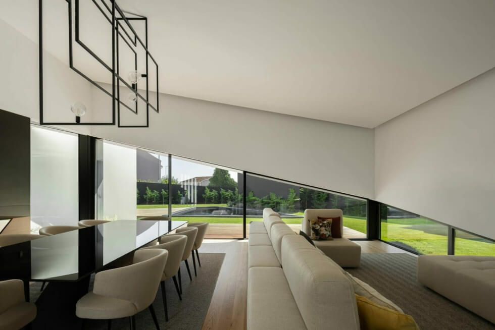 The property is built in the residential neighborhood of Gondomar just east of Porto. It is in close proximity to the street and neighboring houses and thus its unique architecture. The house is characterized by the 3-axis rotation movement of the volume that constitutes the social area of the dwelling. The “tilting” movement allows for the distinction of the different areas of the house. It defined the main entrance but at the same time also enhances the space for the pool patio and gives it its privacy in relation to the influx of traffic.