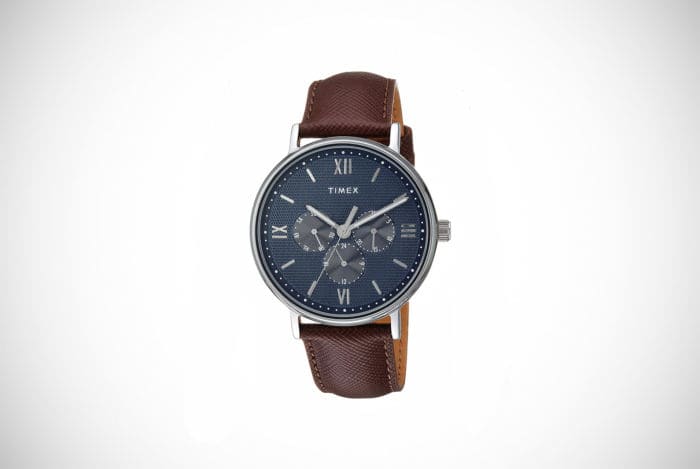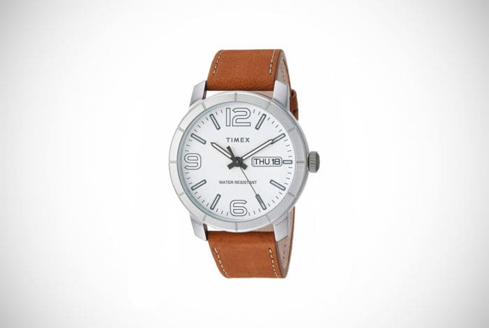 Timex watches for men come in various styles and this stainless steel timepiece is modern and unfussy. The silver-toned face and band combine in a low-key design that’s not extravagant or flashy. Arabic numerals on a white dial makes it easy to read with just a quick glance which helps as the face is smaller than many others at just 35mm. If you’re not built like the proverbial brick building and instead have a smaller frame, this could be a far more flattering pick.