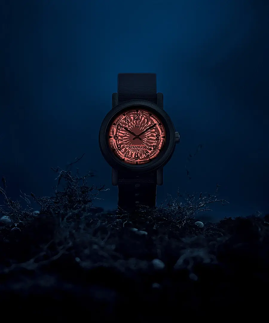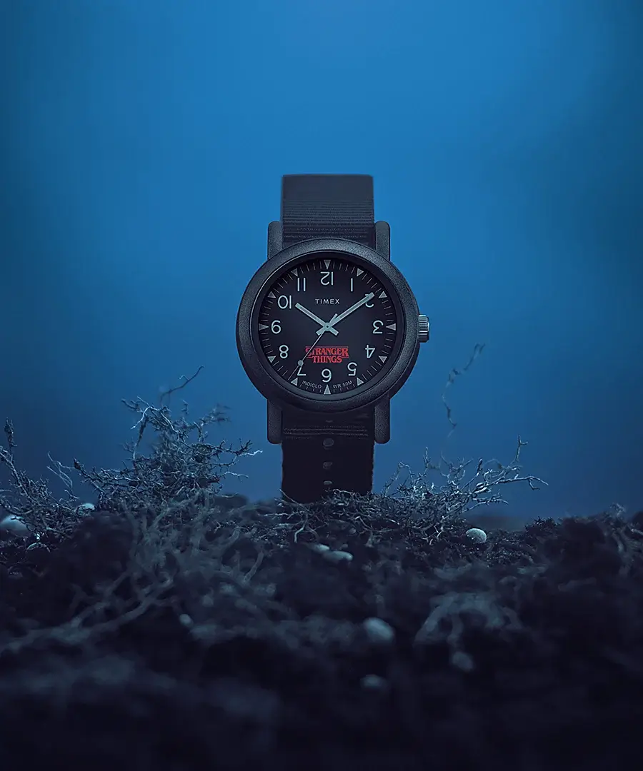 True to the show’s alternate dimension name, the Arabic numeral hour markers are upside down. Not only that, activate the INDIGLO system to shine a blood-red backlight and reveal the Demogorgon imagery on the dial. Take your pick from the Timex x Stranger Things collection and rewatch everything now.