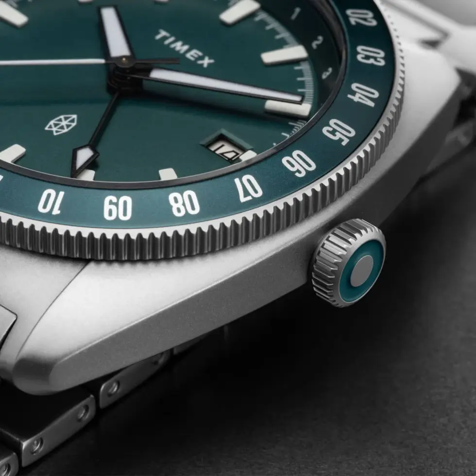 Since drops or impact can easily disfigure a polished surface the Automatic GMT flaunts a matte finish. We like the muted sheen it gives off and how the gray tone contrasts with the bluish-green (Emerald) bezel insert, flange, and dial. The shade also appears on the top of its 3-position screw-down crown.