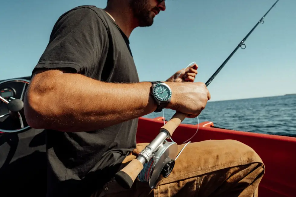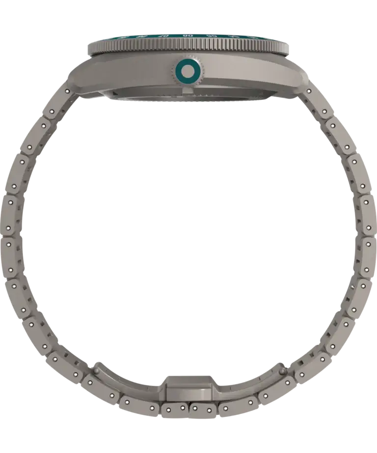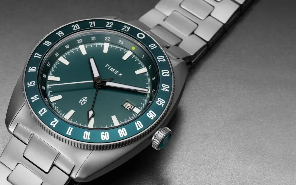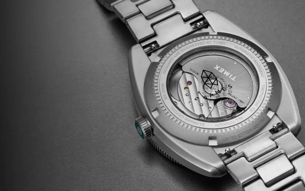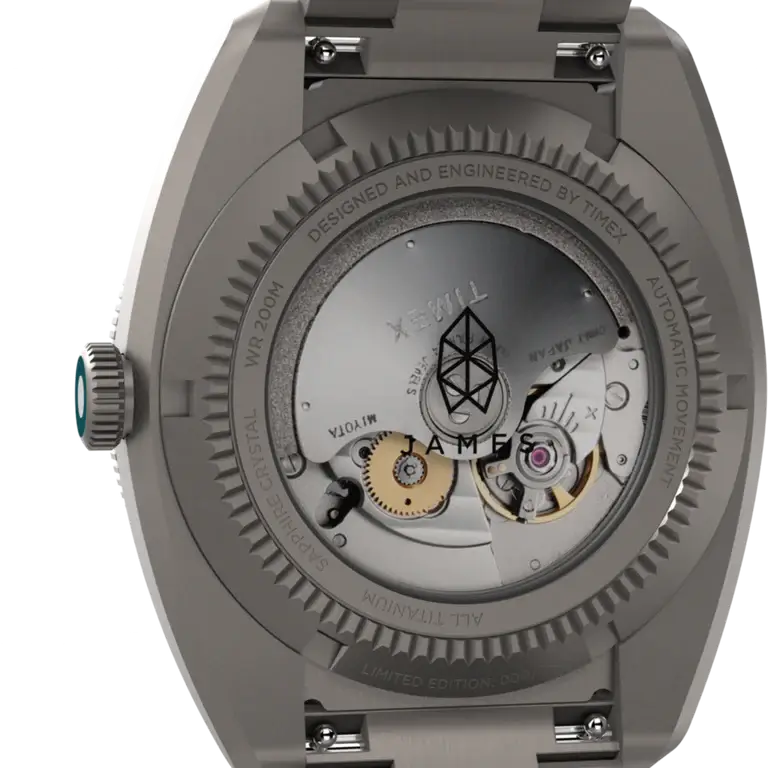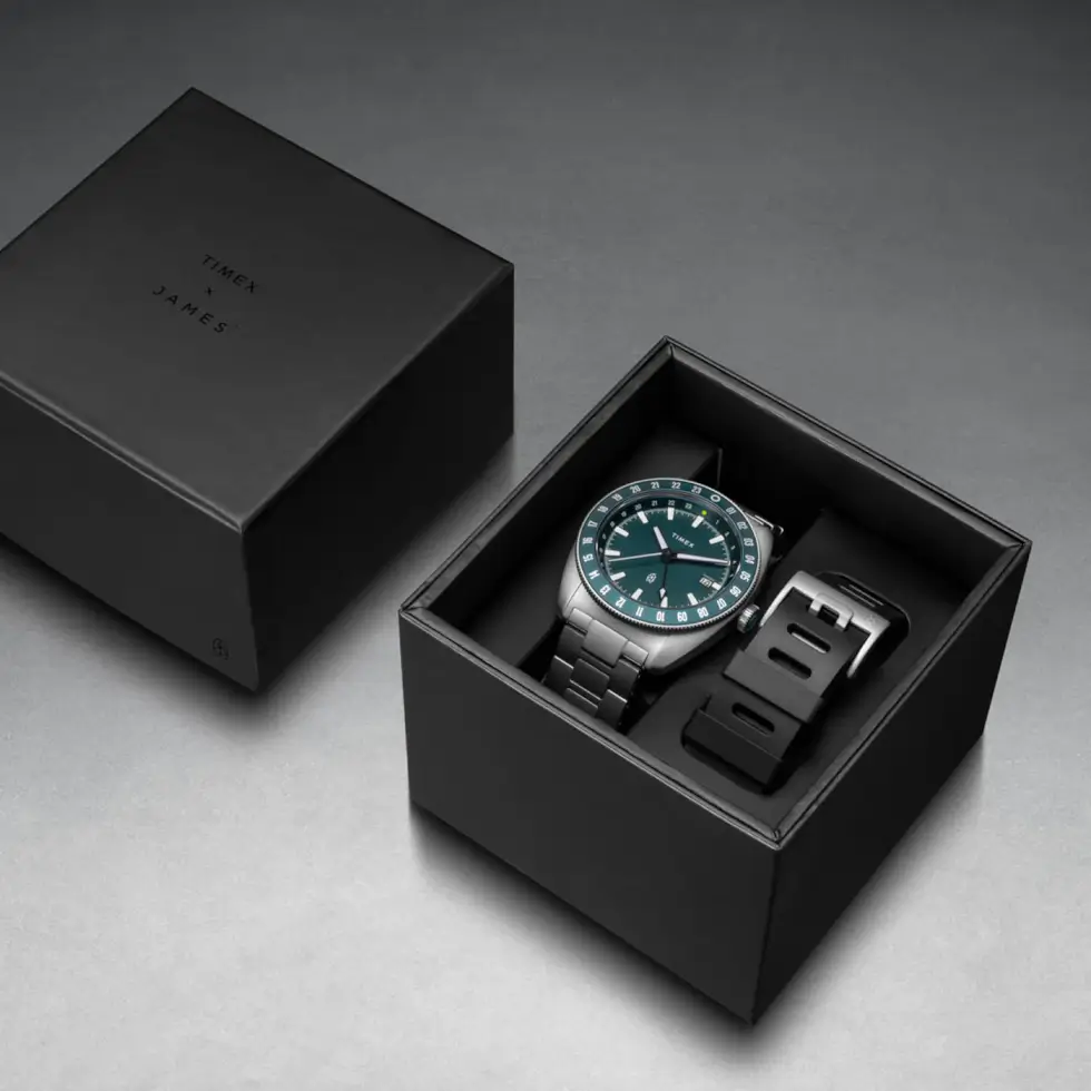 In addition to the 24-hour counters on the bezel insert, the indices also appear on the inner flange just below the sapphire crystal. Meanwhile, against the Emerald dial is The James Brand emblem at 6 o’clock, a Timex signature, a minute track, and applied hour markers in white. Meanwhile, the spot just beside 3 o’clock is occupied by a date window.