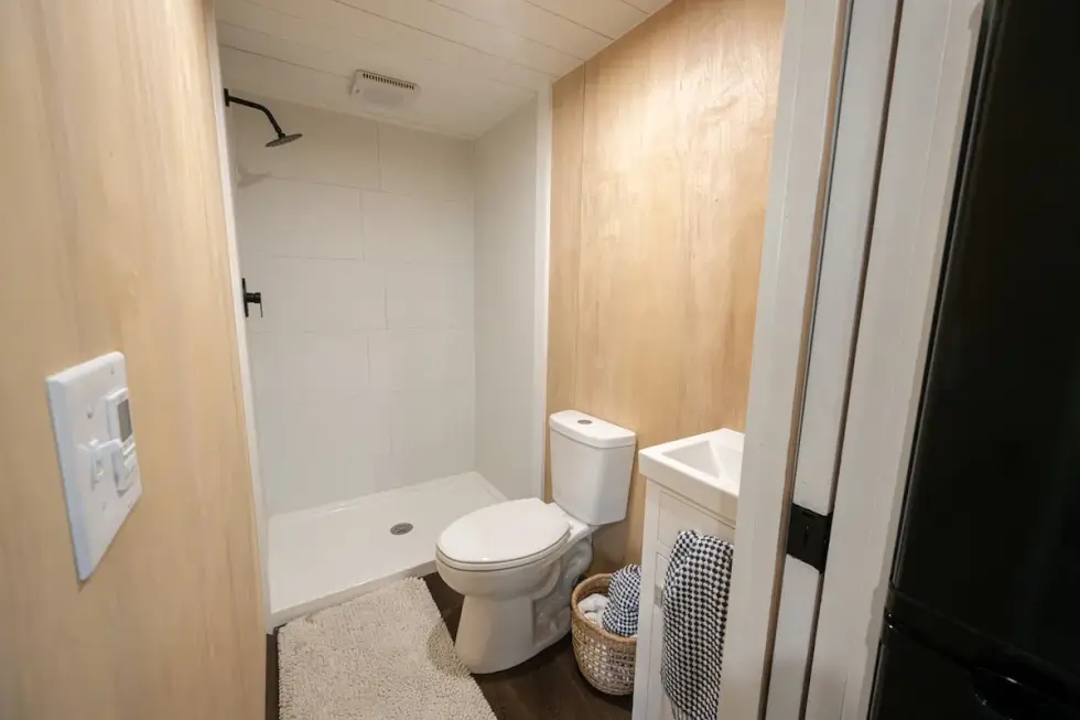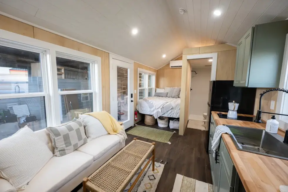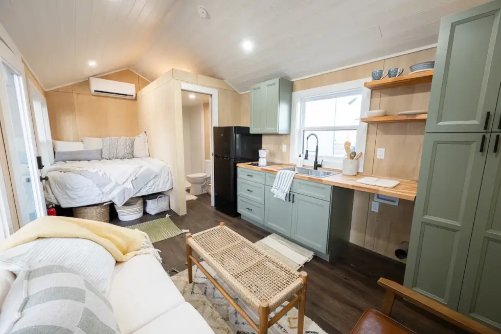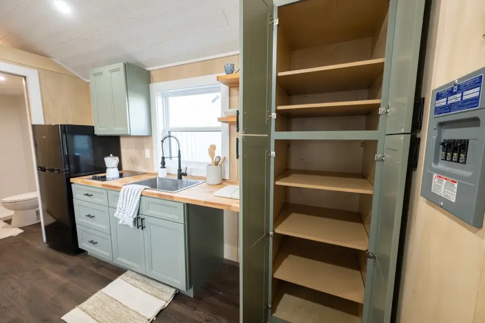 It also has space for a washer/dryer setup and butcher block countertops with a black finish. Likewise, a large floor-to-ceiling pantry provides ample storage options. Meanwhile, the bed on the TinyPlex is on the opposite end and is raised to give way for storage underneath and has an AC unit overhead. Beside it tucked in a little corner is the bathroom, which has a sink, a shower, and a flushing toilet. This house makes the perfect unit for Airbnb rentals, multi-generational living, a vacation home, or as ADU.