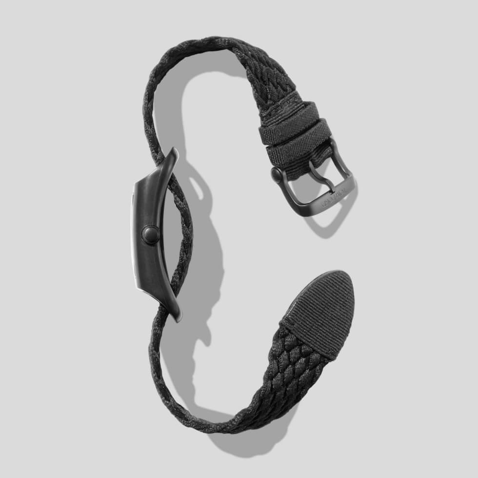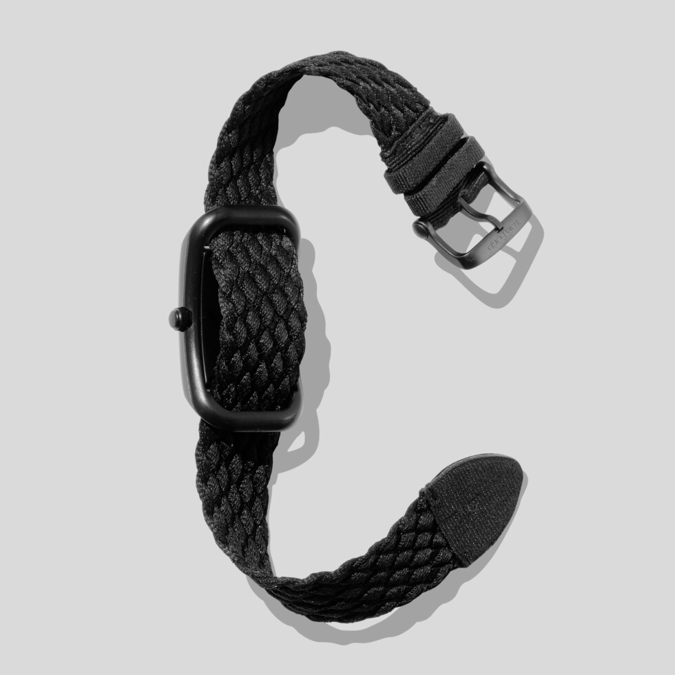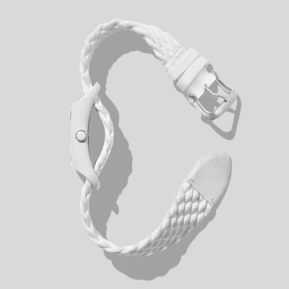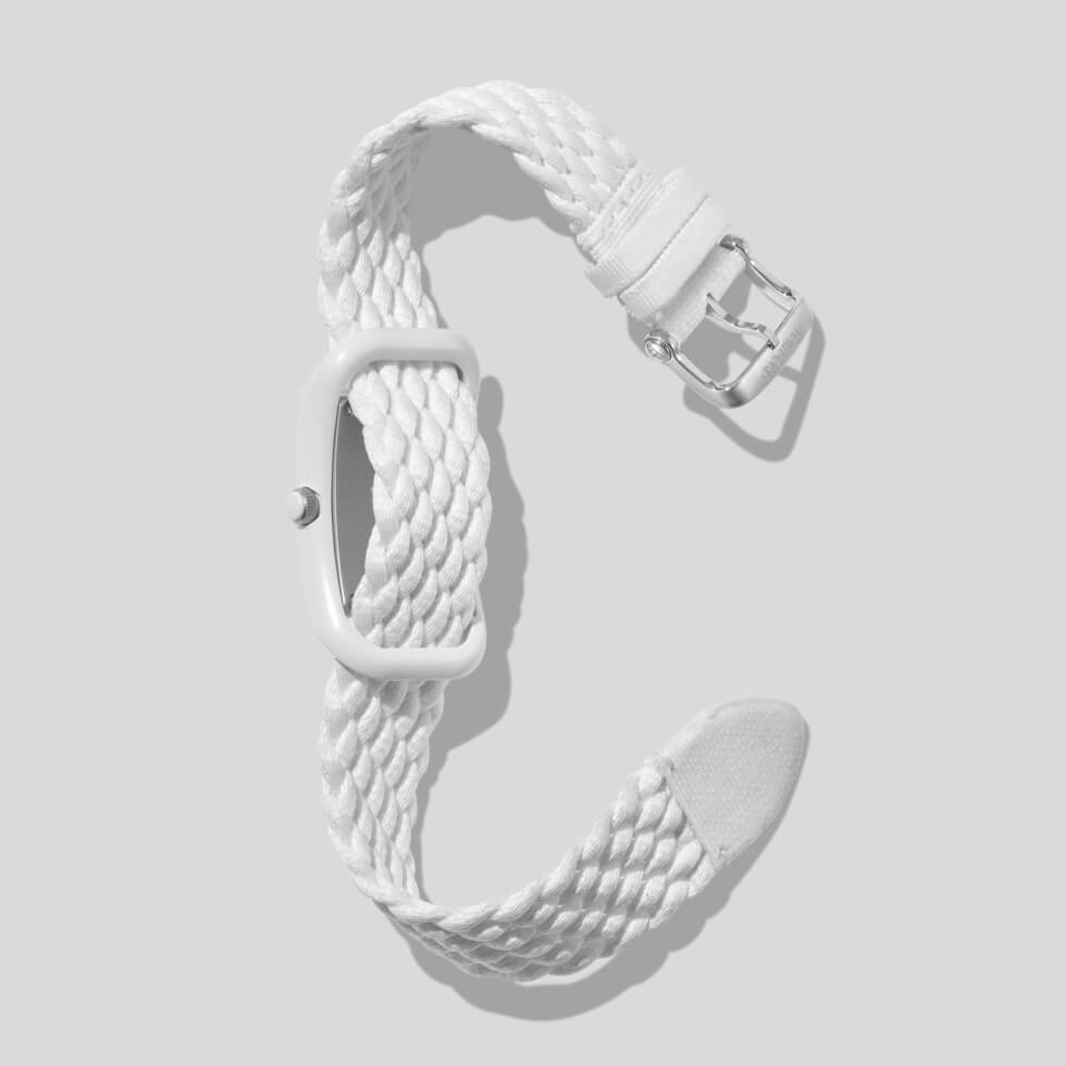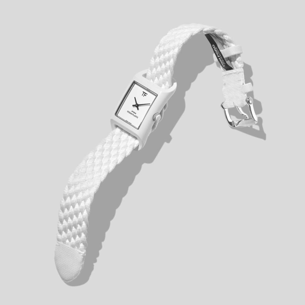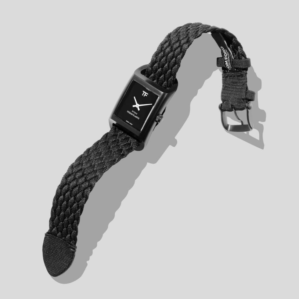 As the collection says, most of its components are in the polymer in question. Tom Ford presents the 004 with a 48.55 mm x 27 mm rectangular case available in black or white. These ship with color-matching braid straps woven out of 100% ocean plastic alongside a pin buckle closure system.