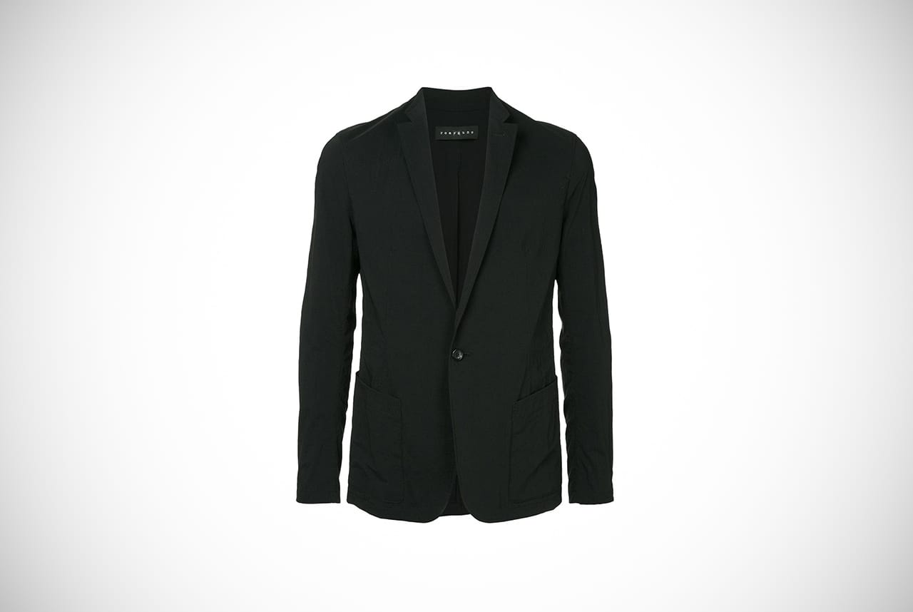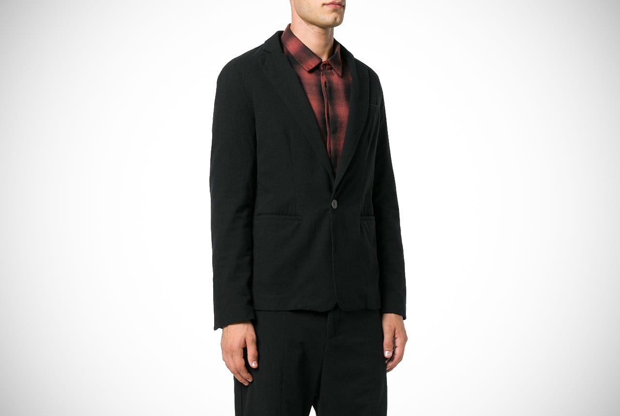 A single button can be found on the front and there are no hip pockets, giving these casual blazers for men a sophisticated edge with its simplicity. On the back, there are no vents as you’d usually expect to find. Instead, there’s an unusual trifold seam arrangement.