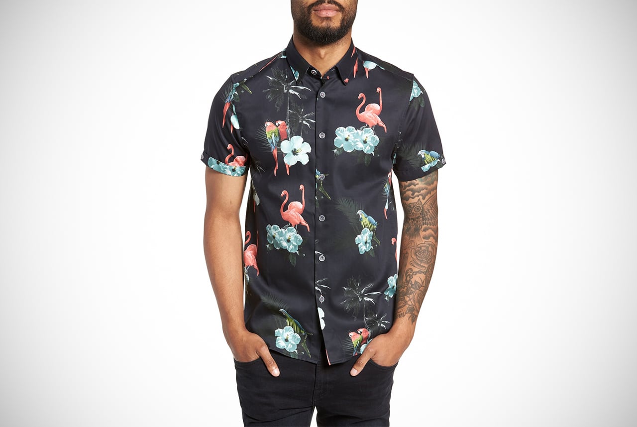 Some men just look to find cheap Tropical Hawaiian shirts for men wherever they pop up. Others head to a designer that can meet their needs in style. This shirt from Ted Baker lets you have all the fun a Hawaiian shirt is for while holding an elegant, repeated pattern that speaks to a business-casual setting.